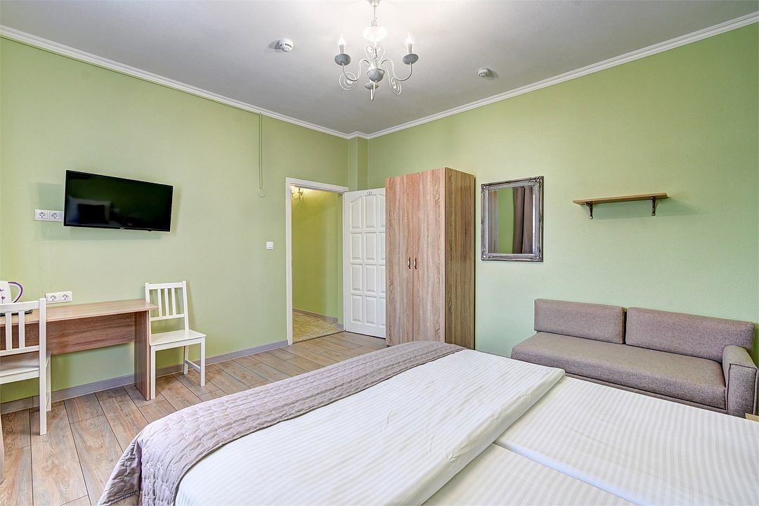 Wi-Fi, кондиционер, фен, халаты, тапочки, двуспальная кровать, две односпальные кровати, шкаф для одежды, журнальный столик, зеркало, душ, стул, туалет, диван-кровать, телевизор с плоским экраном, мини-холодильникВ номере
