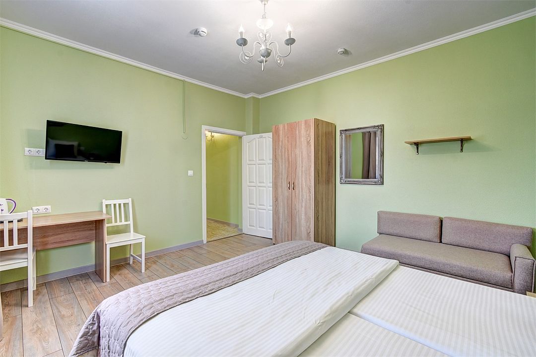 Wi-Fi, кондиционер, фен, халаты, тапочки, двуспальная кровать, две односпальные кровати, шкаф для одежды, журнальный столик, зеркало, душ, стул, туалет, диван-кровать, телевизор с плоским экраном, мини-холодильникВ гостиничном номере
