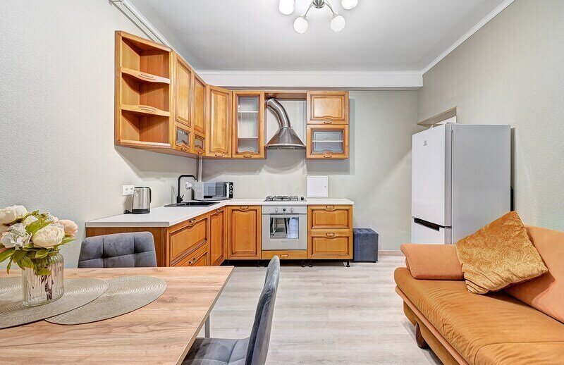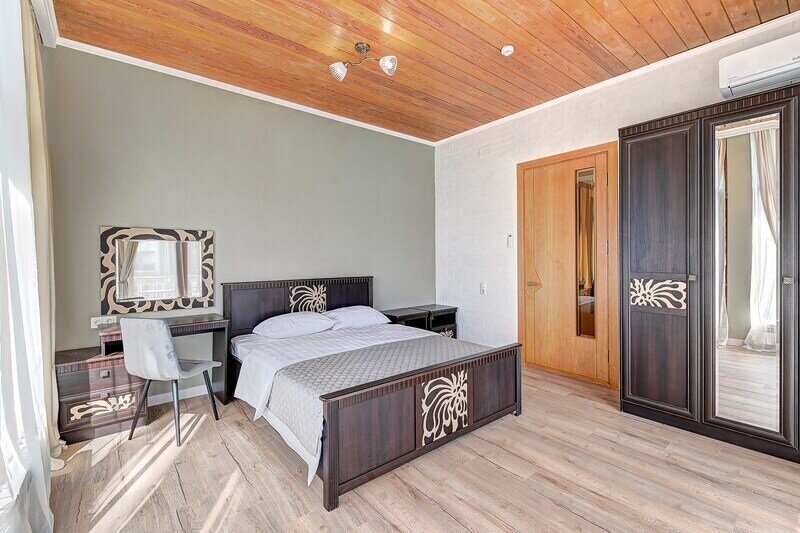 Каждый из номеров оборудован современной мебелью и техникой: удобные кровати, кондиционер, современный телевизор, холодильник, плита для приготовления пищи, микроволновая печь, электрочайник, набор посуды, интернет Wi-Fi, кухня, стиральная машина, фен, санузел с душем или ванной – всё, что нужно для комфорта.