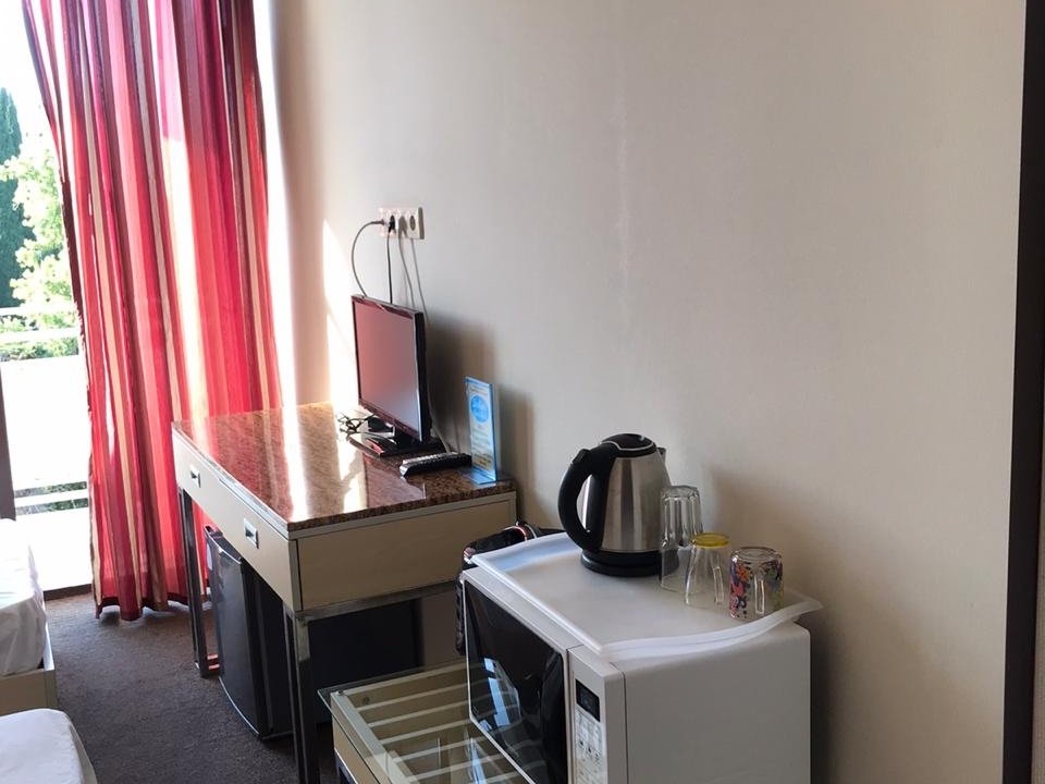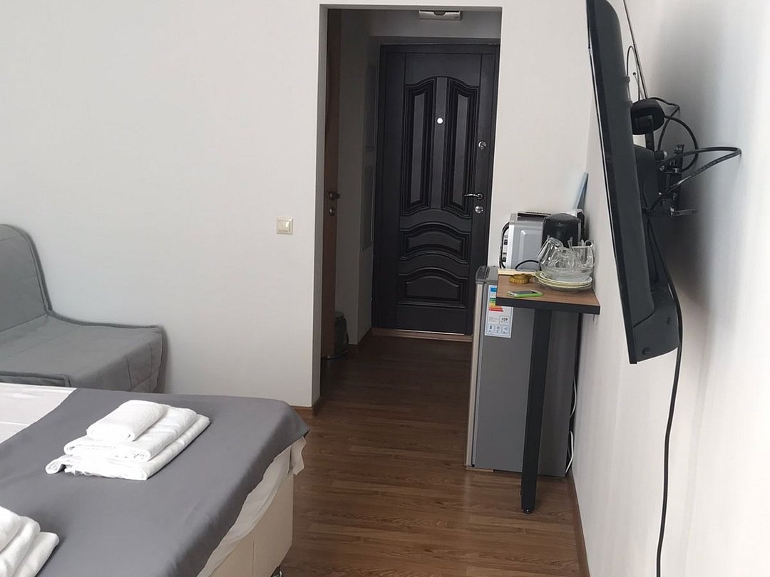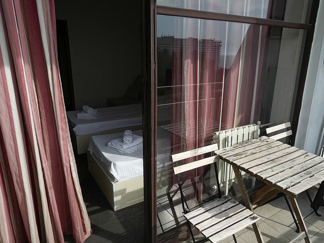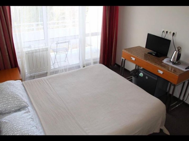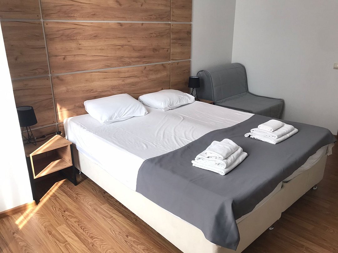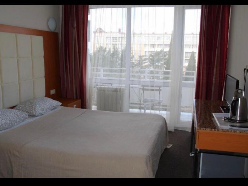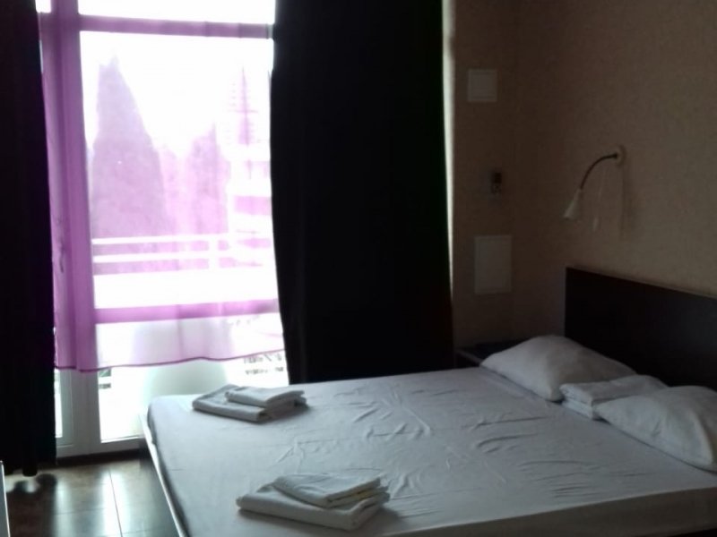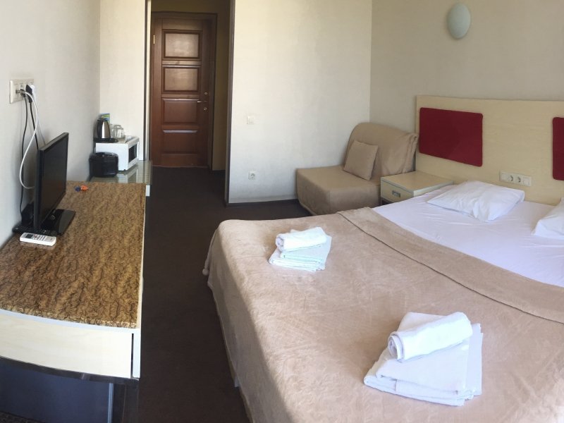 апартаменты двухместные с балконом. Большая кровать, душ, туалет, кухонный уголок, холодильник, чайник, микроволновка. Кондиционер, фен, стиральная машина, телевизор,Wi-FiВ гостиничном номере