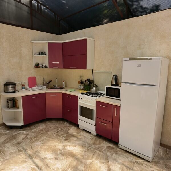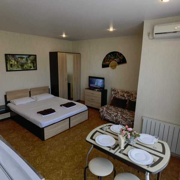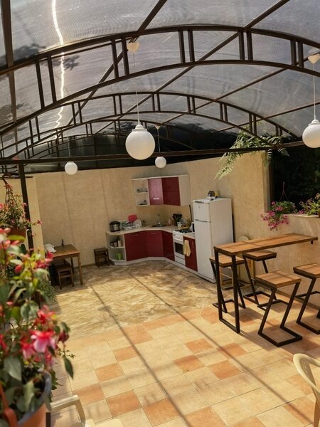 Семейный отдыхДостоинстваМне здесь было хорошо) Общая кухня находится на свежем воздухе, под навесом. Она довольно хорошо оборудована, есть даже мангал. Мой номер был оснащен собственным санузлом и кондиционером, а также имел балкон - очень удобно. Хозяева производят впечатление доброжелательных и отзывчивых людей. До пляжа тоже недалеко.