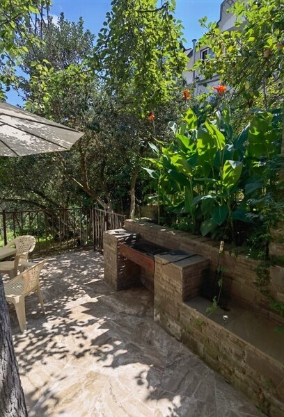 Летняя кухня с обширной террасой площадью 80 квадратных метров, где можно пообедать под виноградной лозой и насладиться пением птиц. Кухня оборудована всей необходимой посудой и техникой для приготовления пищи: холодильником, плитой и духовкой, микроволновой печью, чайником и мультиваркой