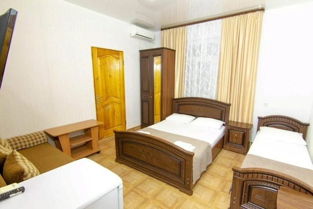 Уютный и светлый трёхместный номер идеально подойдёт для семьи с ребёнком или компании из трёх гостей, которые ценят комфорт и удобство во время отдыха у моря. Номер оформлен в тёплых спокойных тонах и оборудован одной двуспальной кроватью и одной односпальной кроватью (или диваном-кроватью), что обеспечивает комфортное размещение для всех гостей. Большие окна наполняют комнату естественным светом и создают приятную атмосферу для отдыха. В номере предусмотрено всё необходимое для комфортного проживания: • кондиционер • телевизор с плоским экраном • холодильник • шкаф для одежды • прикроватные тумбы • стол и стулья • бесплатный Wi-Fi Санузел в номере — оборудован душем, туалетом и раковиной, предоставляются полотенца и необходимые туалетные принадлежности. Трёхместный номер «Стандарт» в гостевом доме «Три пальмы» — это отличное сочетание цены, уюта и функциональности, идеально подходящее для комфортного отдыха вблизи моряУслуги и удобства