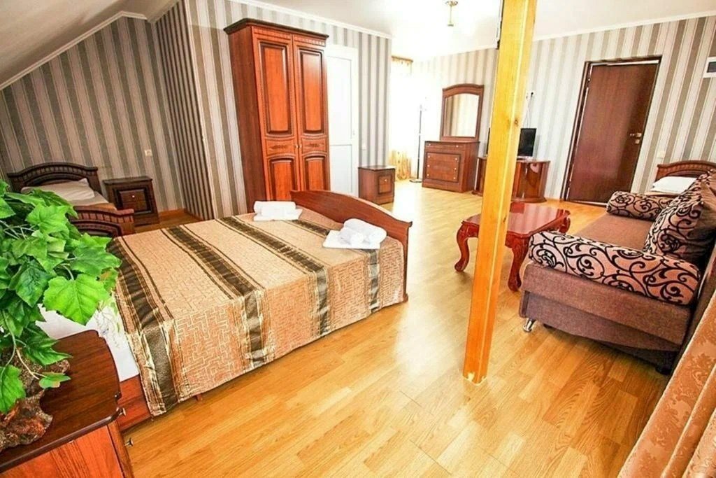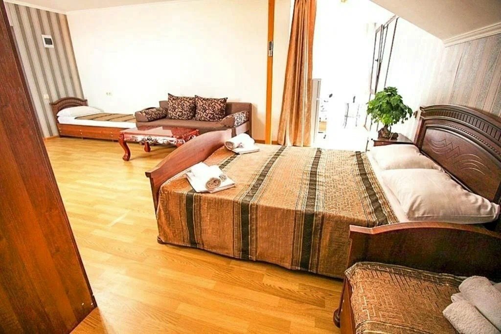 Идеальный вариант для семьи или компании до 5 человек, которые хотят разместиться с комфортом и в одной комнате. Номер оборудован: • 1 двуспальные кровати ,1 односпальная и 1диван-кровать • ❄ Кондиционер • Плоский телевизор • Холодильник • Шкаф и прикроватные тумбы • Большое окно с дневным светом • Собственный санузел (душ и туалет в номере) • Чистое постельное бельё и полотенца Интерьер выполнен в классическом стиле с качественной мебелью и аккуратным ремонтом, номер тёплый, уютный и подходит для длительного проживания.Услуги и удобства