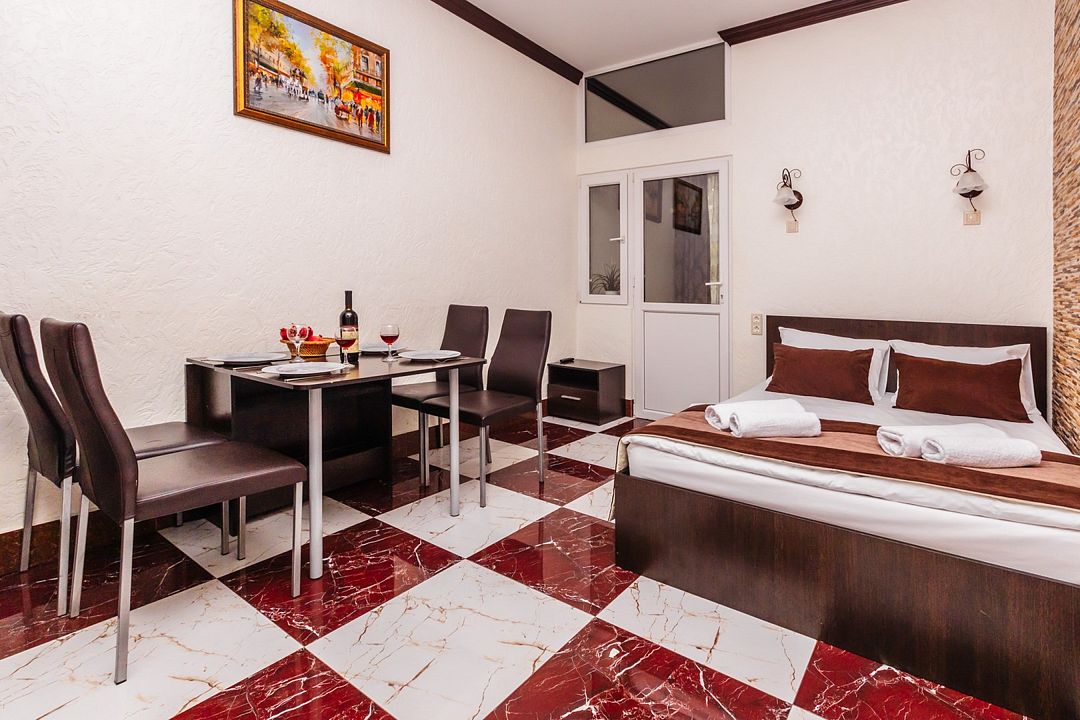 Современные номера расположены в трехэтажном строении. В каждом номере есть набор необходимой удобной мебели, кондиционер, холодильник, телевизор ЖК, электрический чайник. Все номера оснащены санузлом с ванной или душем, феном и туалетно-косметическими принадлежностями. Апартаменты оснащены мини-кухнями или полноценными кухнями с техникой и посудой. Часть номеров имеют балконы с летней мебелью.