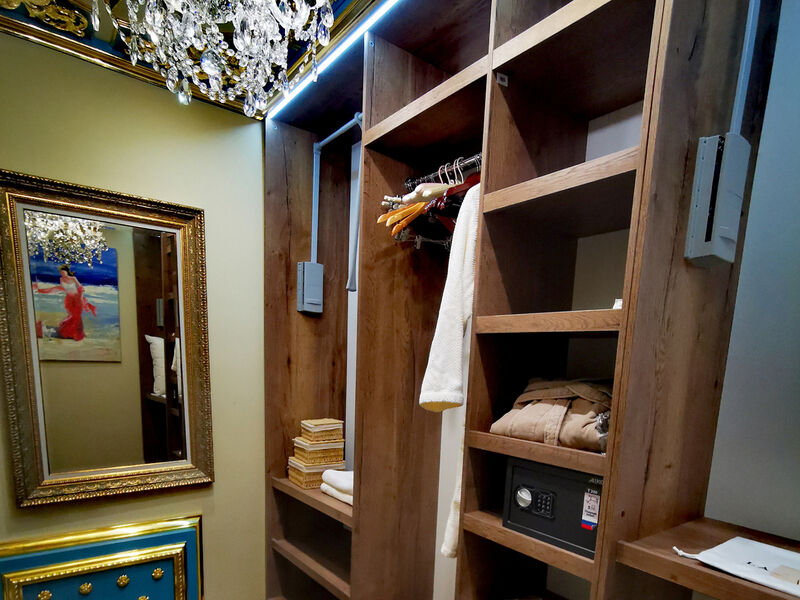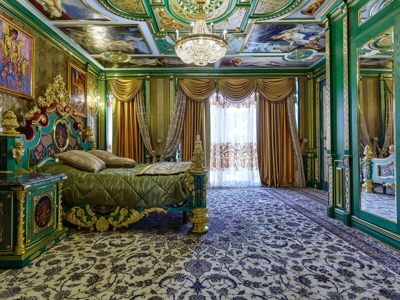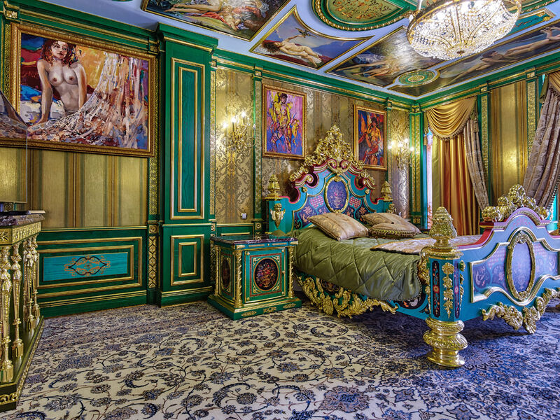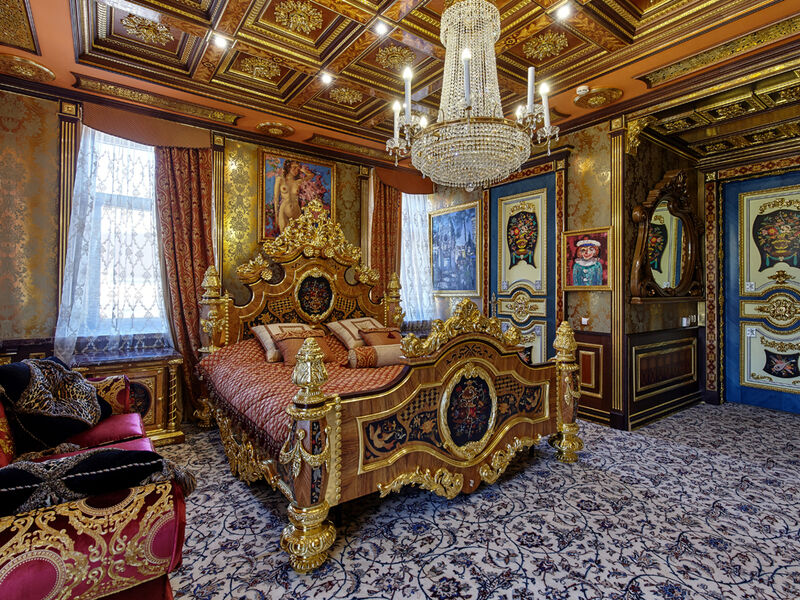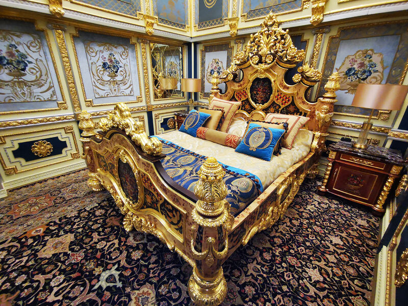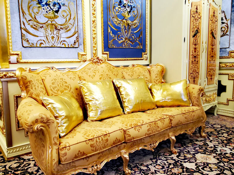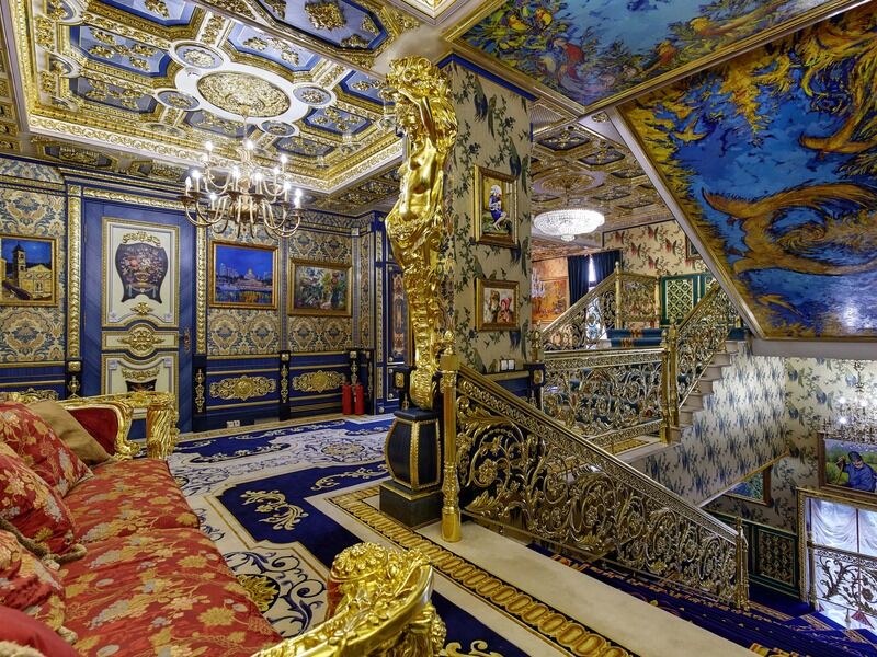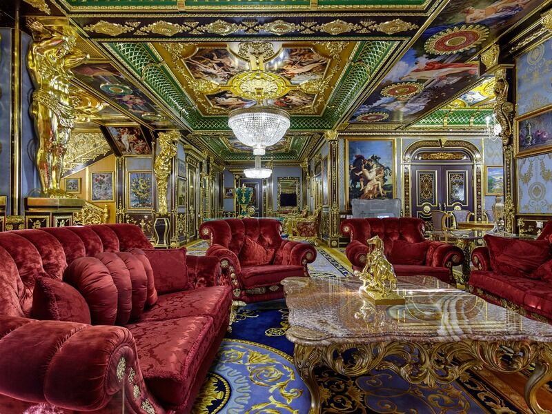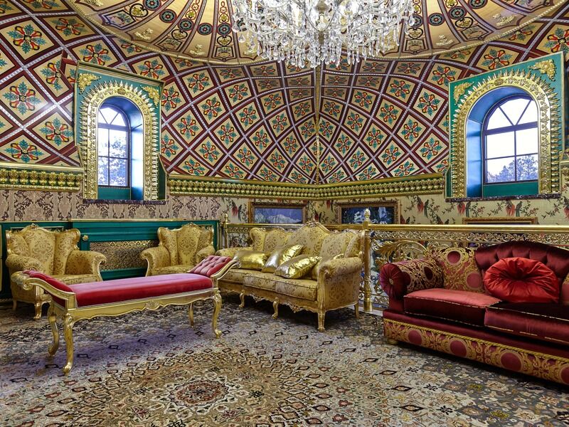 Отделка стен, потолков, предметы мебели, освещения изготовлены исключительно вручную с использованием самых благородных материалов: малахит, сусальное золото, самшит, ясень, итальянский мрамор, хрусталь. Многочисленные предметы искусства созданы в единственном экземпляре российскими художниками.