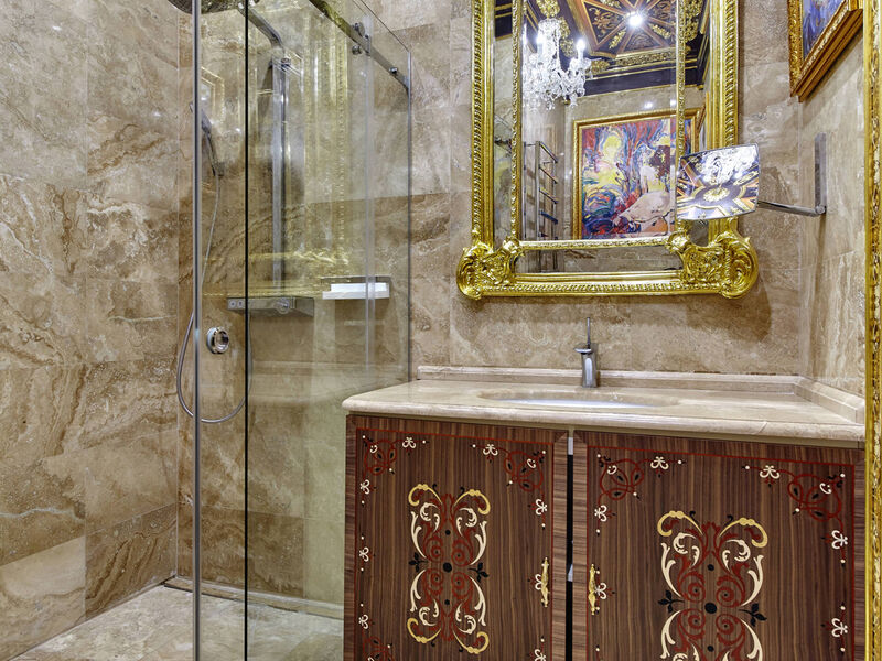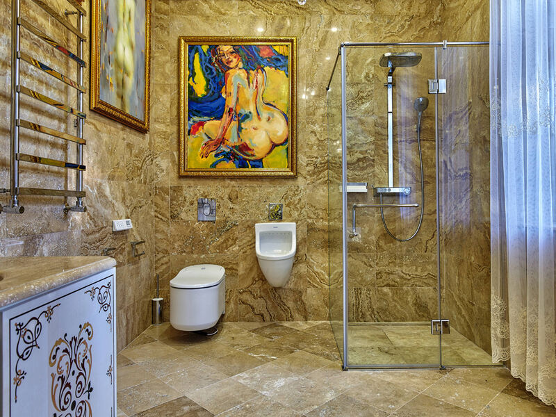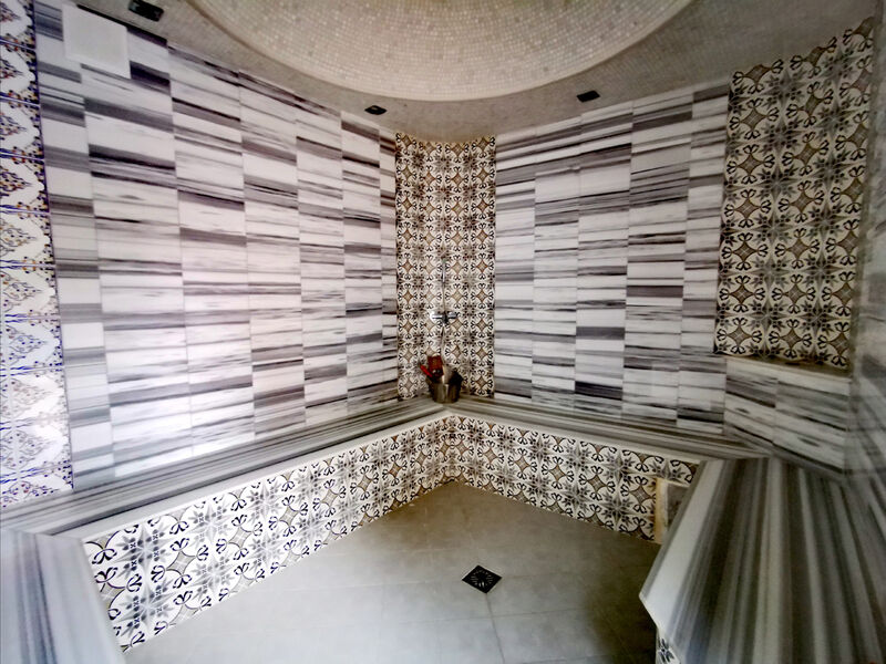 Умиротворяющий хамам, выполненный из натурального мрамора, с парением при температуре до 60°. Вместимость — до 5 человек.