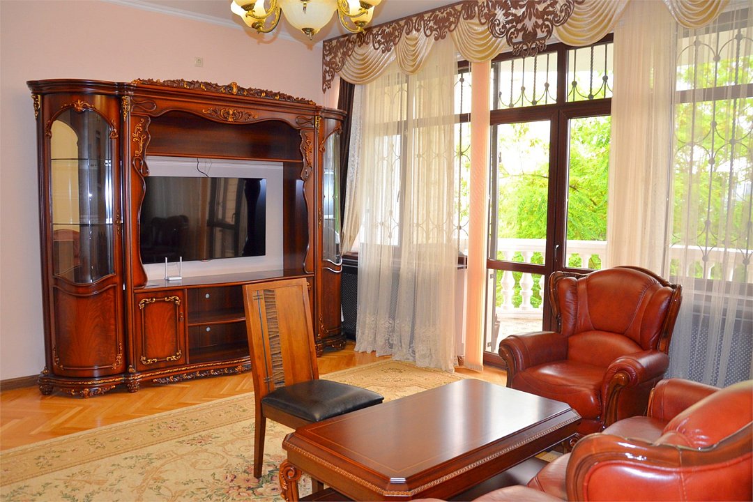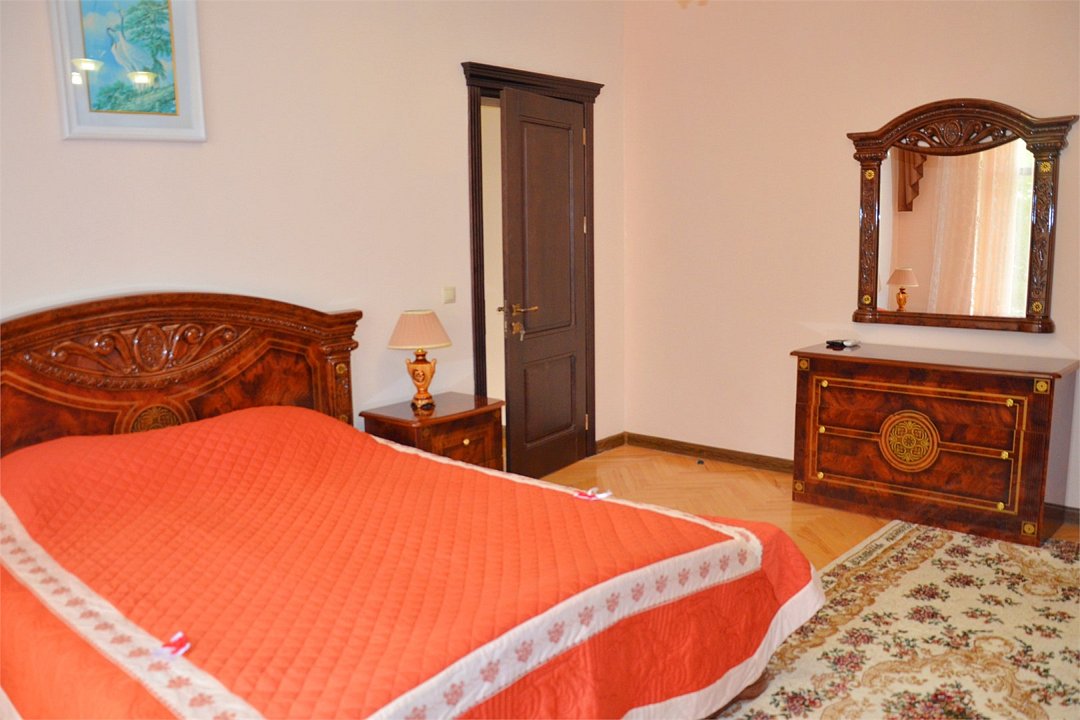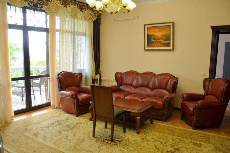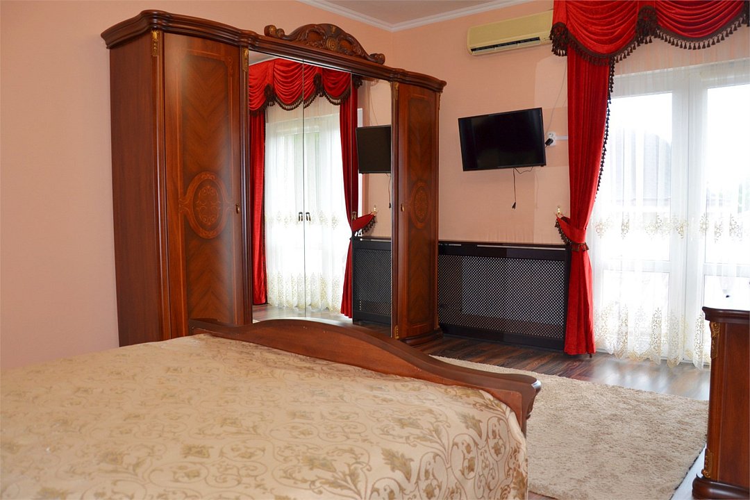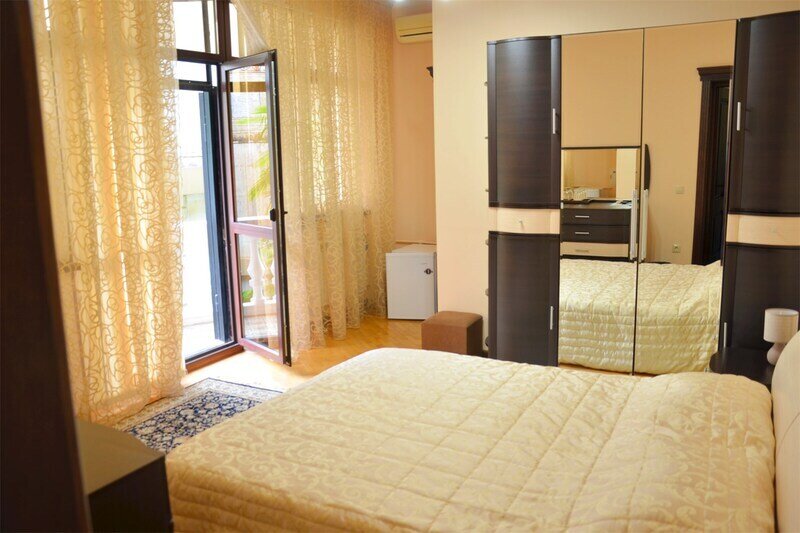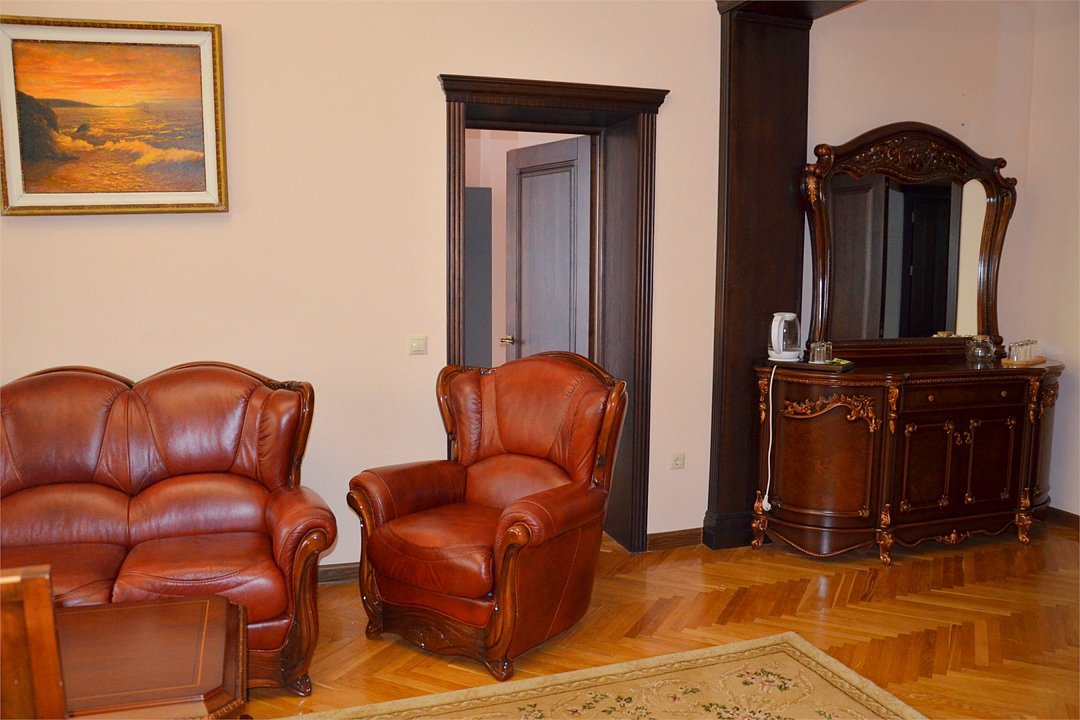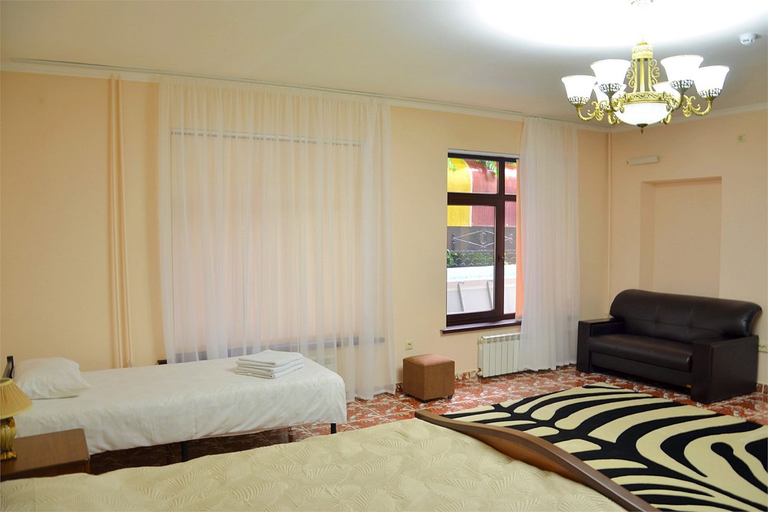 "Люкс с балконом" идеальный выбор для семьи или компании до 6 человек, т.к. это 3-х комнатный просторный номер площадью 95 м2 с шикарными видами на город и море с балкона. В 1-й спальне для Вас большая удобная двуспальная кровать с ортопедическим основанием, прикроватные тумбы и светильники. Также в спальне есть комод с зеркалом, большой шкаф, телевизор, кондиционер, холодильник и стул. Из неё есть проход в ванную комнату с душем, туалетом, феном, комплектом полотенец и гигиеническими принадлежностями. В просторной гостиной имеется большой диван-кровать и 2 кресла из резного дуба ручной работы, журнальный столик, стул, комод с зеркалом и чайной станцией, шкаф-стенка с телевизором и Wi-Fi роутером. Из гостиной Вы можете выйти на просторный балкон со столиком, диваном и 2 стульями из ротанга и провести время в уютной обстановке, наслаждаясь потрясающими видами на город и море, а также свежим морским воздухом. Это идеальное место для утреннего кофе или романтического ужина под открытым небом. Во второй спальне 2 односпальные кровати с прикроватными тумбами, кондиционером, холодильником, телевизором, шкафом и 2 стульями для комфортного отдыха. Кроме того, у отеля есть зона отдыха с бассейном и мангальной зоной, где Вы можете чудесно провести время в кругу друзей или близких. Отель также находится в непосредственной близости от развлекательного парка Ривьера, где Вы сможете насладиться прогулками и активным отдыхом. Побалуйте себя и своих близких роскошным отдыхом! Забронируйте "Люкс с балконом" и проведите время незабываемо в центре Сочи с шикарными видами на горы и море!Услуги и удобства