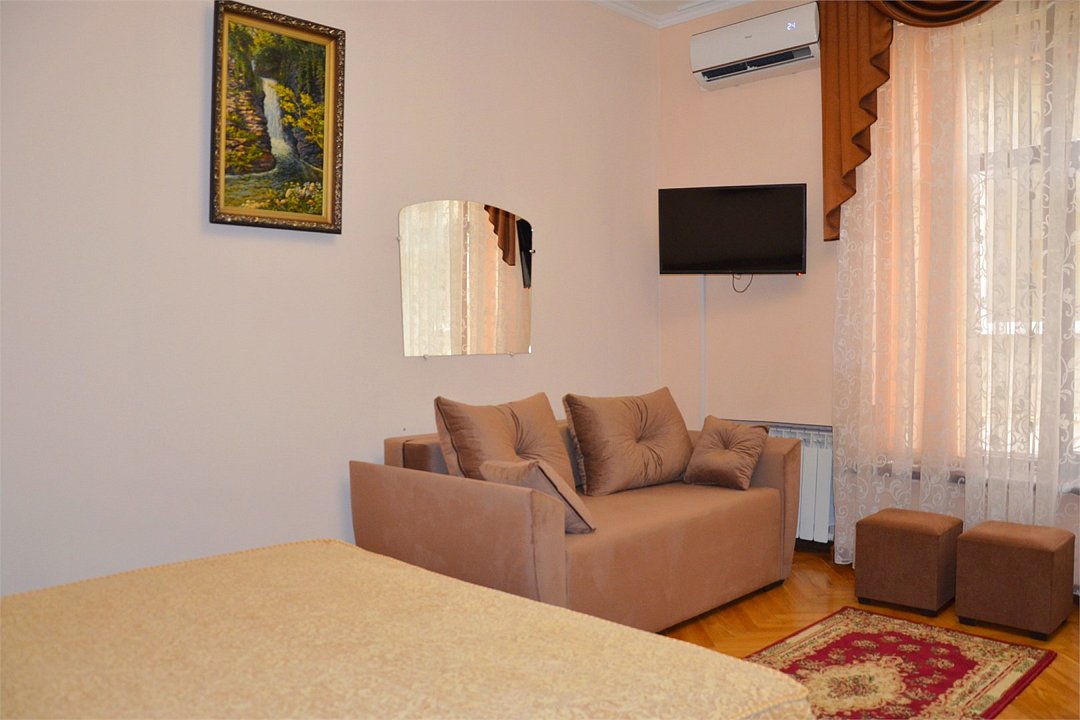 Вы хотите чудесно отдохнуть в уютном номере в центре Сочи? Тогда номер Стандарт в Бутик-отеле RP Усадьба - это именно то, что вам нужно! Номер площадью 22 м2 предназначен для размещения до 3-х человек. В номере есть всё необходимое для комфортного отдыха: большая двуспальная кровать, прикроватные тумбы со светильниками, диван-кровать, мини-холодильник, телевизор, Wi-Fi, кондиционер и комод с зеркалом. В ванной комнате фен, комплект полотенец и гигиенические принадлежности. Бутик-отель RP Усадьба расположен вблизи развлекательного парка Ривьера, который сможете с удовольствием посещать. Забронируйте номер Стандарт и насладитесь своим отдыхом в Сочи!Услуги и удобства