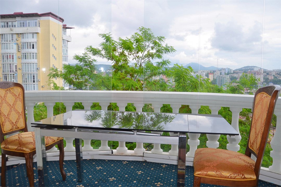 "Люкс с балконом и кухней" — это просторнейший 2-х комнатный номер повышенной комфортности с кухней и балконом общей площадью 93 м2 с потрясающим панорамным видом на город и море, вызывающим восхищение. В спальне есть всё самое лучшее для прекрасного отдыха и чудесных снов: большая двуспальная кровать с ортопедическим основанием и прикроватные тумбы со светильниками, большой шкаф, телевизор, кондиционер, холодильник, комод с зеркалом и стул. Просторная гостиная включает удобный диван и кресло из резного дерева ручной работы, журнальный столик, стул, комод, шкаф-стенку с телевизором и Wi-Fi роутером для раздачи интернета. Здесь Вы сможете уютно провести время в роскошной обстановке и прекрасными видами на город. Из гостиной Вы всегда можете выйти на просторный застекленный балкон, где для Вашего удобства имеется стол и стулья. Здесь Вы сможете любоваться потрясающими панорамными видами на город и море. Это идеальное место для утреннего кофе или романтического ужина. В кухне есть всё необходимое: кухонный гарнитур с встроенной электрической плитой и духовкой, обеденный стол, 4 стула, мойка, микроволновка, чайник, набор посуды и большой холодильник. Вы сможете приготовить свои любимые блюда и насладиться ужинами в уютной обстановке. У отеля есть зона отдыха с бассейном и мангальная зона, позволяющие с удовольствием провести время на свежем воздухе. В непосредственной близости находится развлекательный парк Ривьера, где Вы сможете насладиться прогулками, активным отдыхом и посещением Дельфинария. Используйте возможность побаловать себя и свою семью роскошным отдыхом! Забронируйте "Люкс с балконом и кухней" и проведите время незабываемо!Услуги и удобства