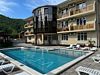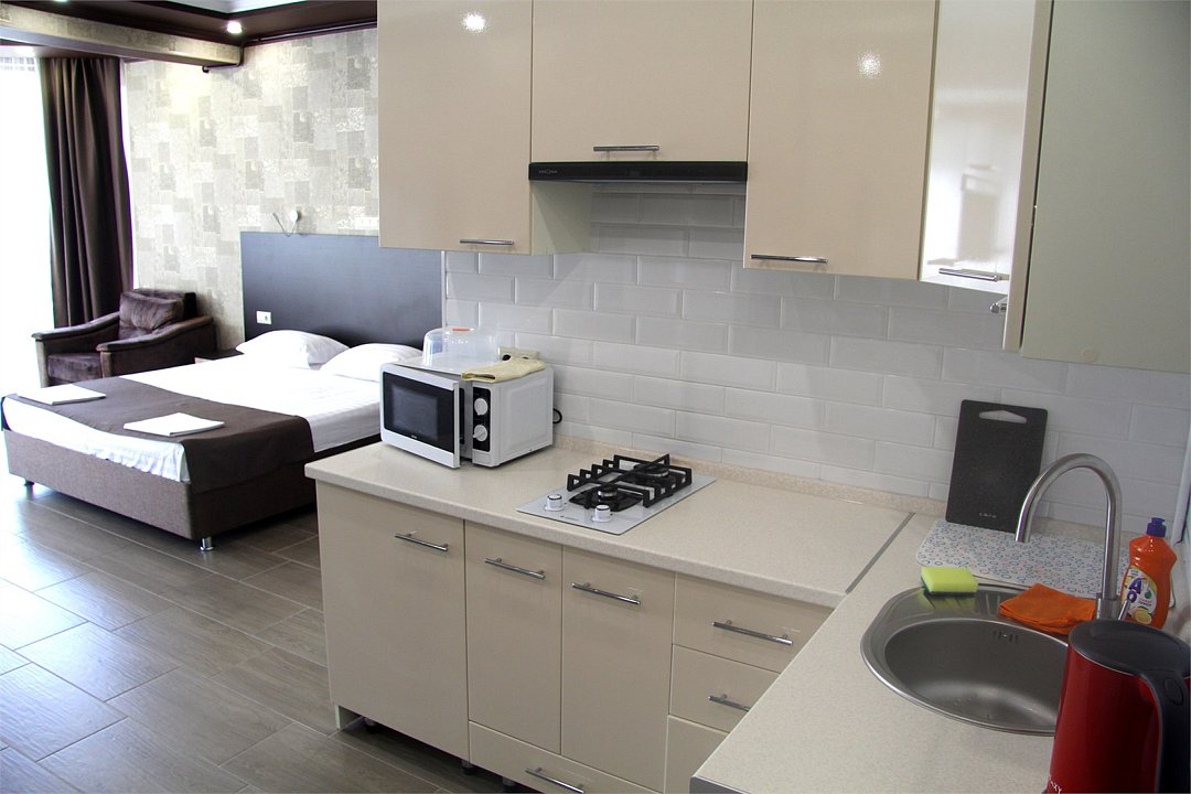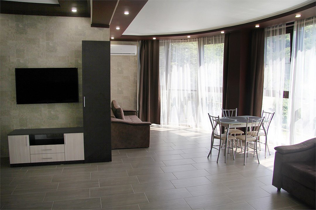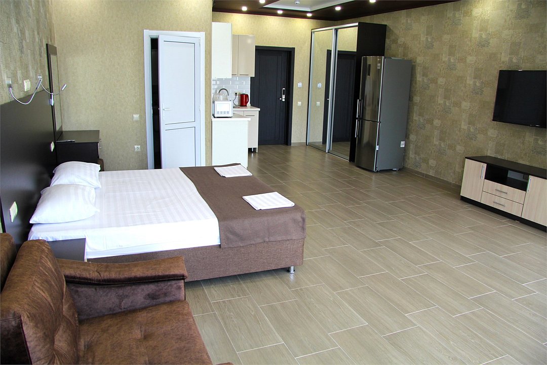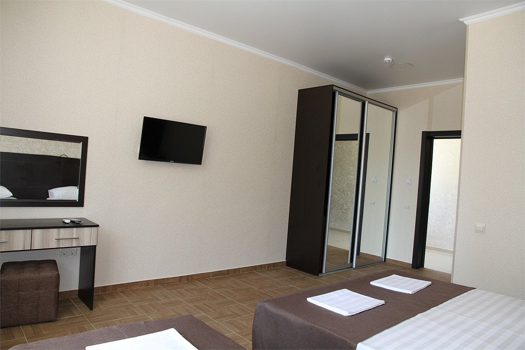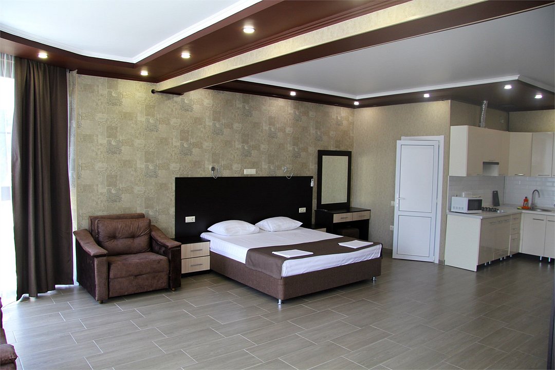 Просторный номер с панорамным витражом, со своей кухней. Двуспальная кровать, диван кровать, два кресло кровати. Большой двухкамерный холодильник с морозилкой. Вид открывается на бассейн, горы и детскую площадку. Кухня оборудована всем необходимым для приготовления и употребления пищи.Услуги и удобства