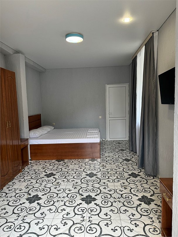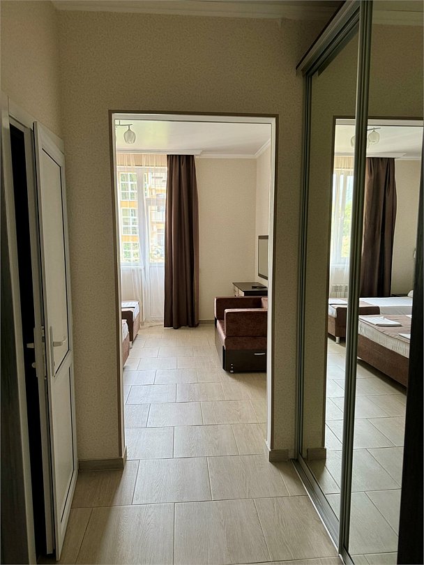 Уютный 3-х комнатный номер с кухней: 1. Номер с двуспальной кроватью с балконом. 2. Номер с двумя раздельными кроватями. 3. Зал с кухней и балконом.Услуги и удобства