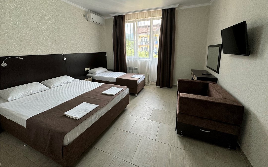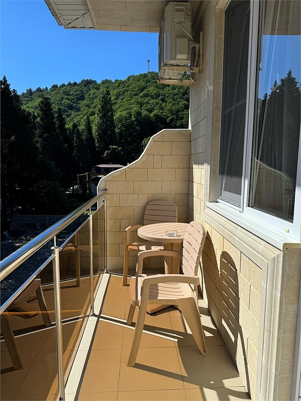 Уютный 3-х местный номер с балконом. В номере двуспальная кровать и односпальная кровать, можно оборудовать доп.местом в виде удобного кресло-кровать. А в балконе можно не только выпить чашечку кофе на креслах но и любоваться красивому пейзажу.Услуги и удобства
