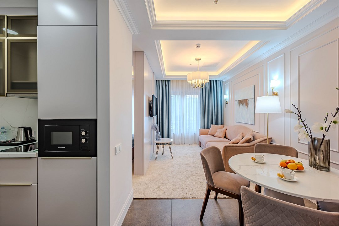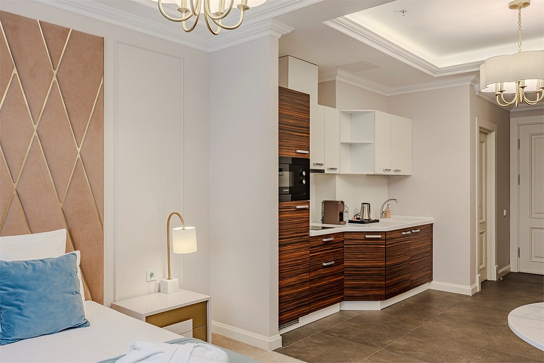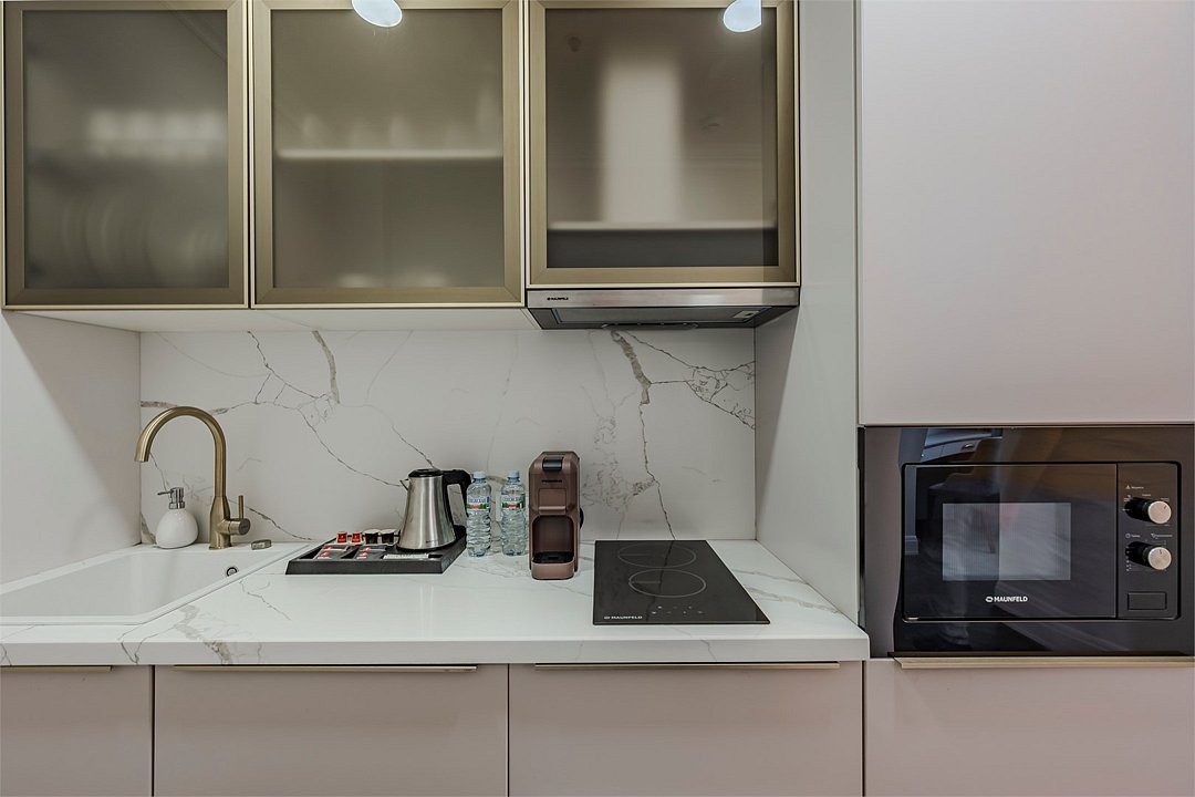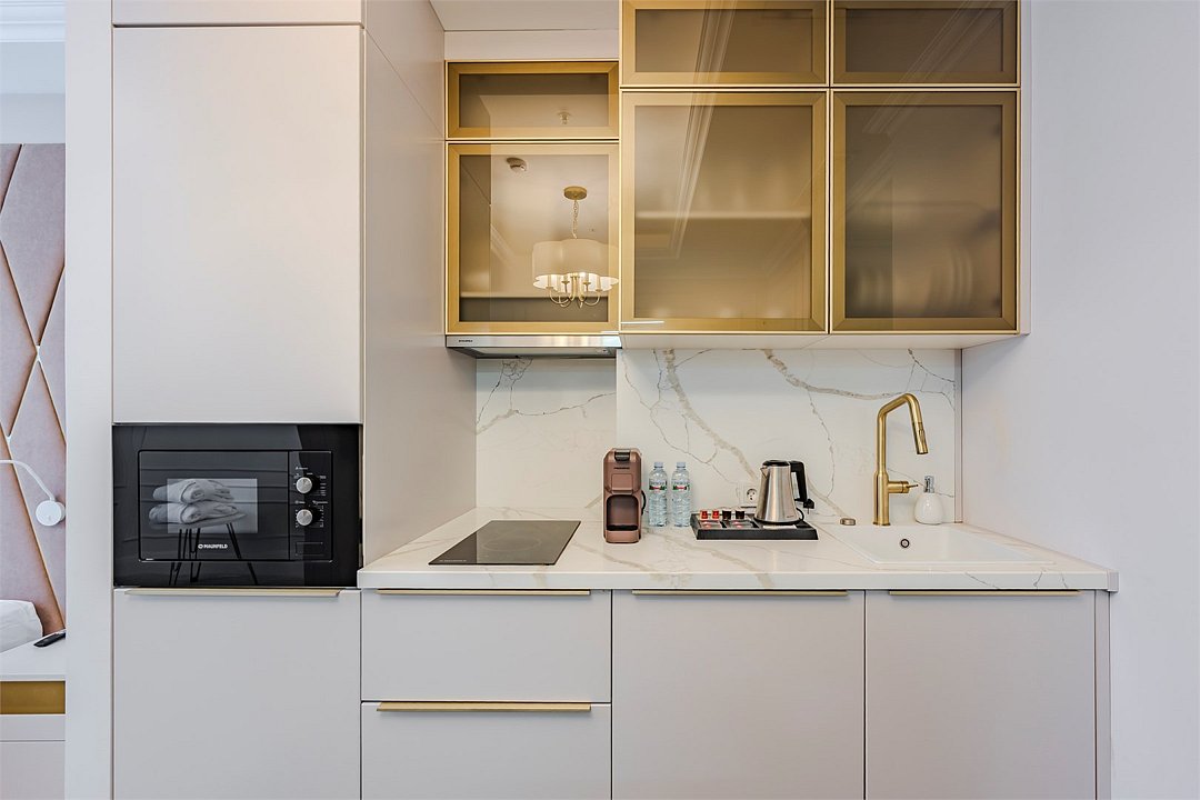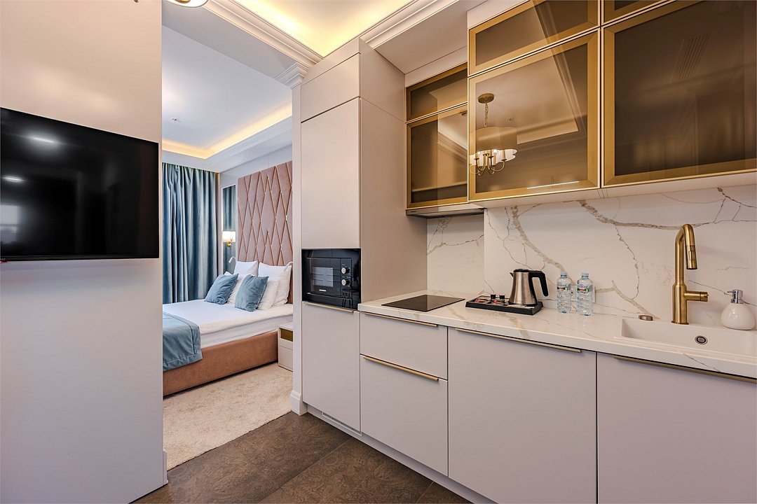 Все номера оснащены кухнями. Двухслойные стеклопакеты обеспечат полную звукоизоляцию. Блэкаут шторы, в закрытом состоянии полностью поглощающие свет, обеспечат полноценный глубокий сон.