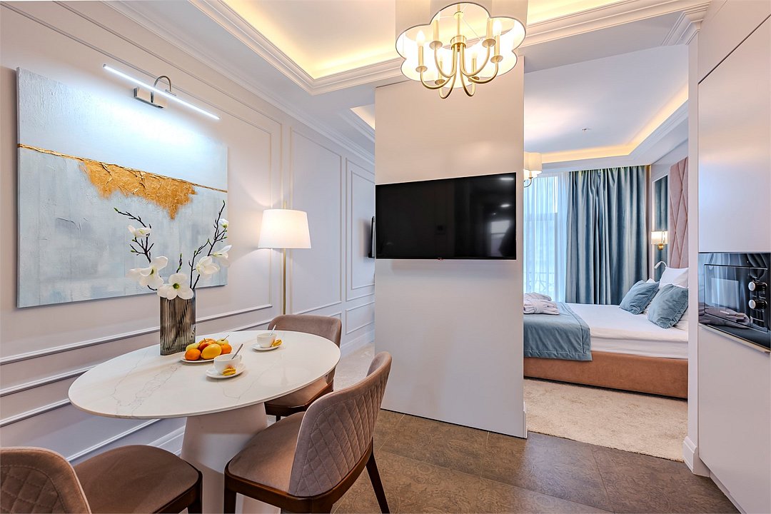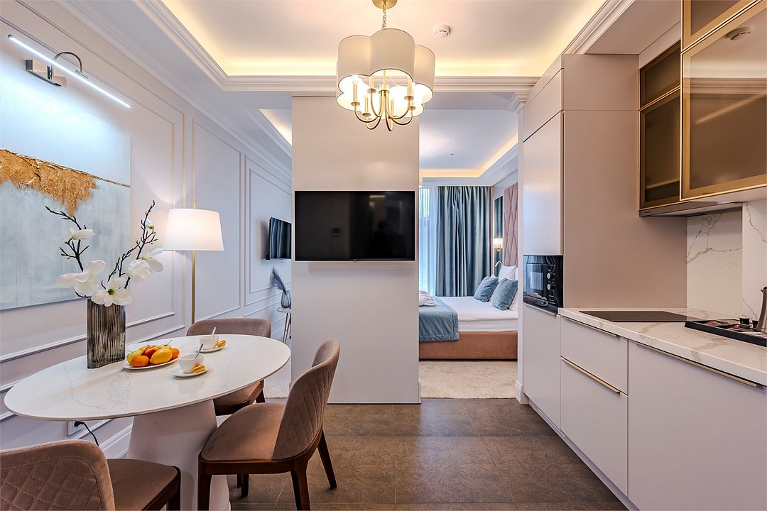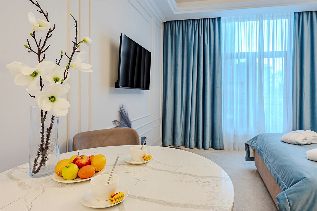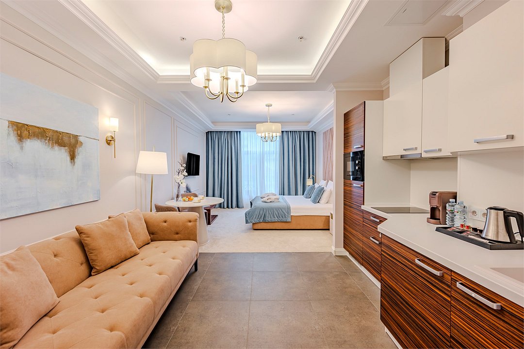 Апартаменты с видом на живописный центральный Сочи, площадью от 37 м2. Номер разделён функциональной декоративной перегородкой, отделяющей спальную зону с двуспальной кроватью от гостиной с диваном. Все номера данной категории имеют полностью оборудованную кухню и ванную комнату с ванной / душем.Услуги и удобства