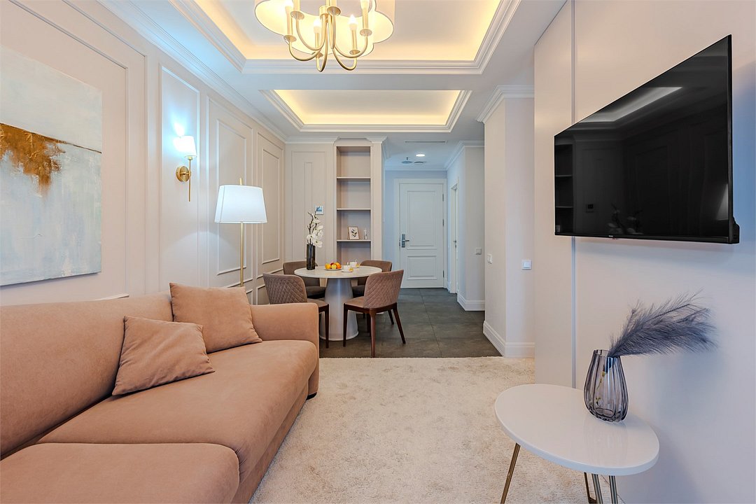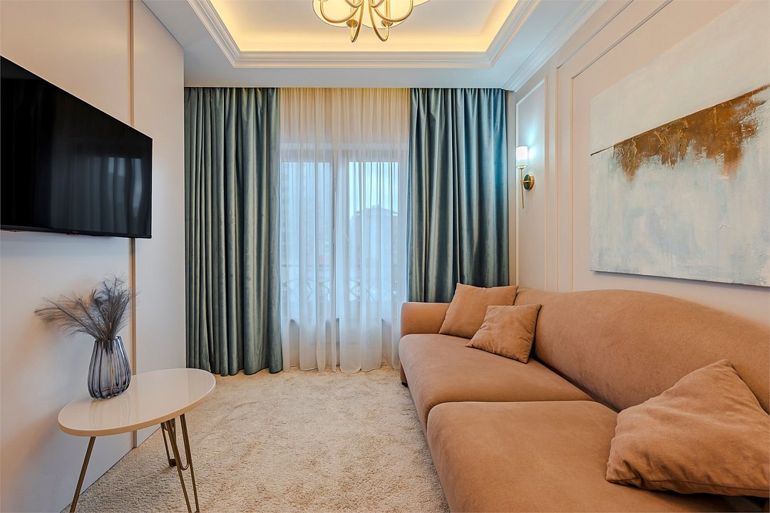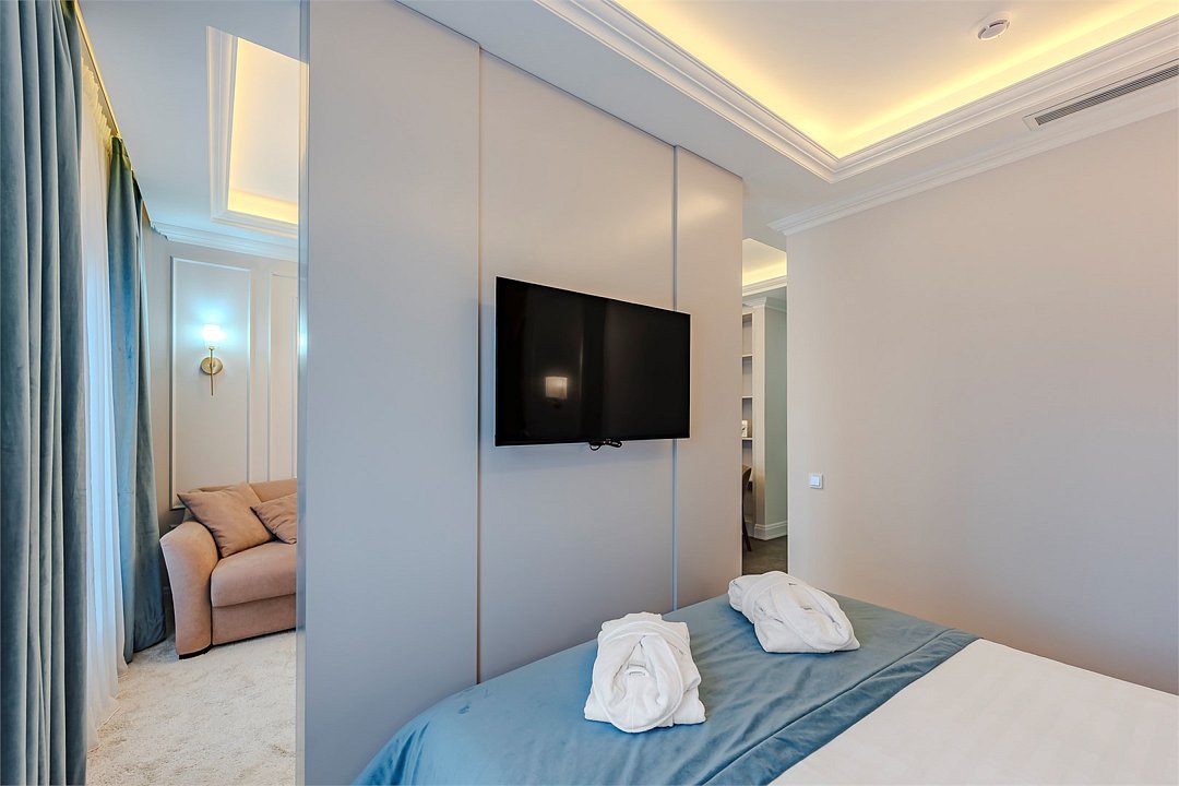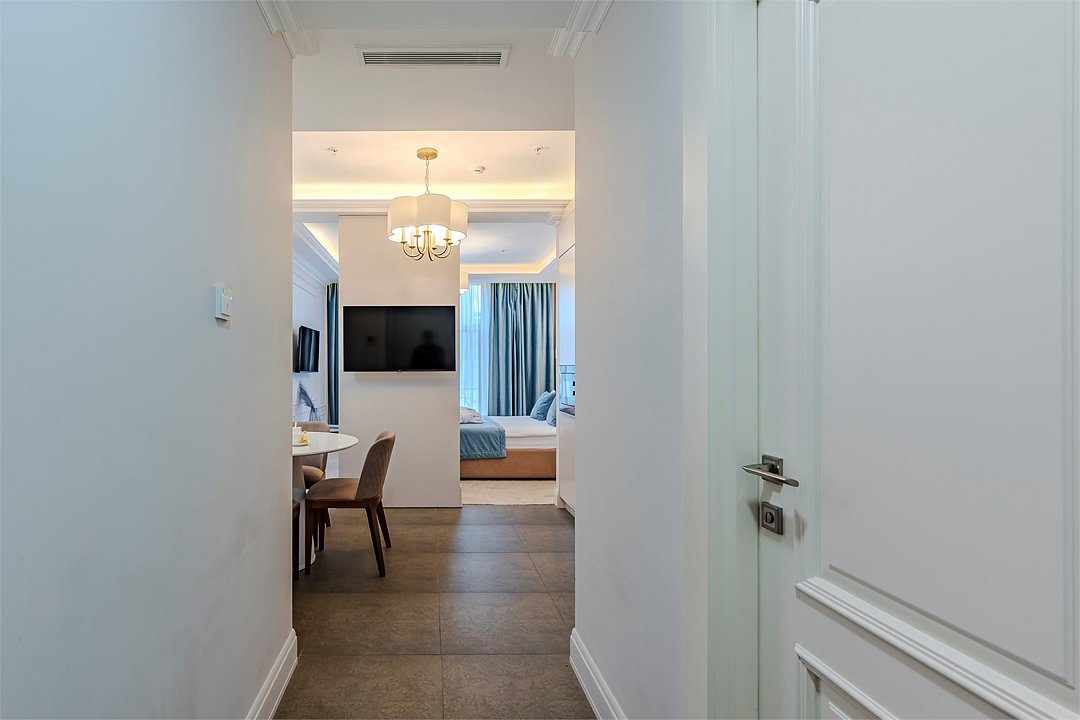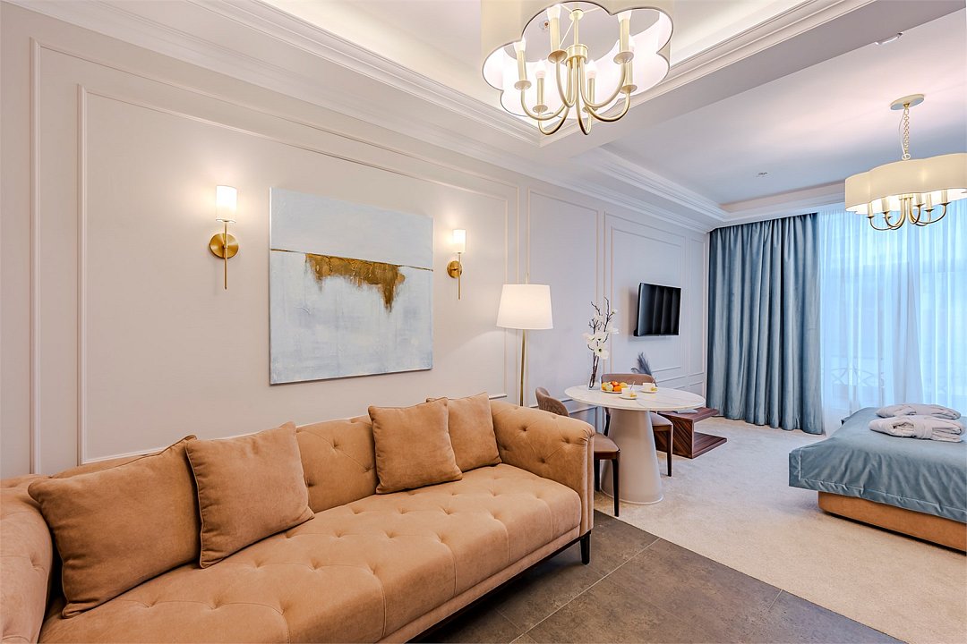 Апартаменты с видом на живописный центральный Сочи, площадью от 37 м2. Номер разделён функциональной декоративной перегородкой, отделяющей спальную зону с двуспальной кроватью от гостиной с диваном. Все номера данной категории имеют полностью оборудованную кухню и ванную комнату с ванной / душем.Услуги и удобства