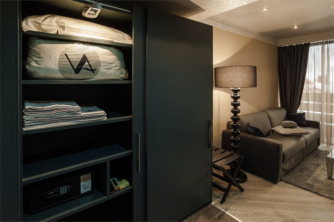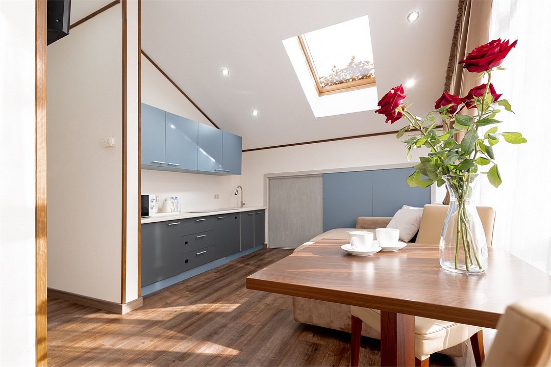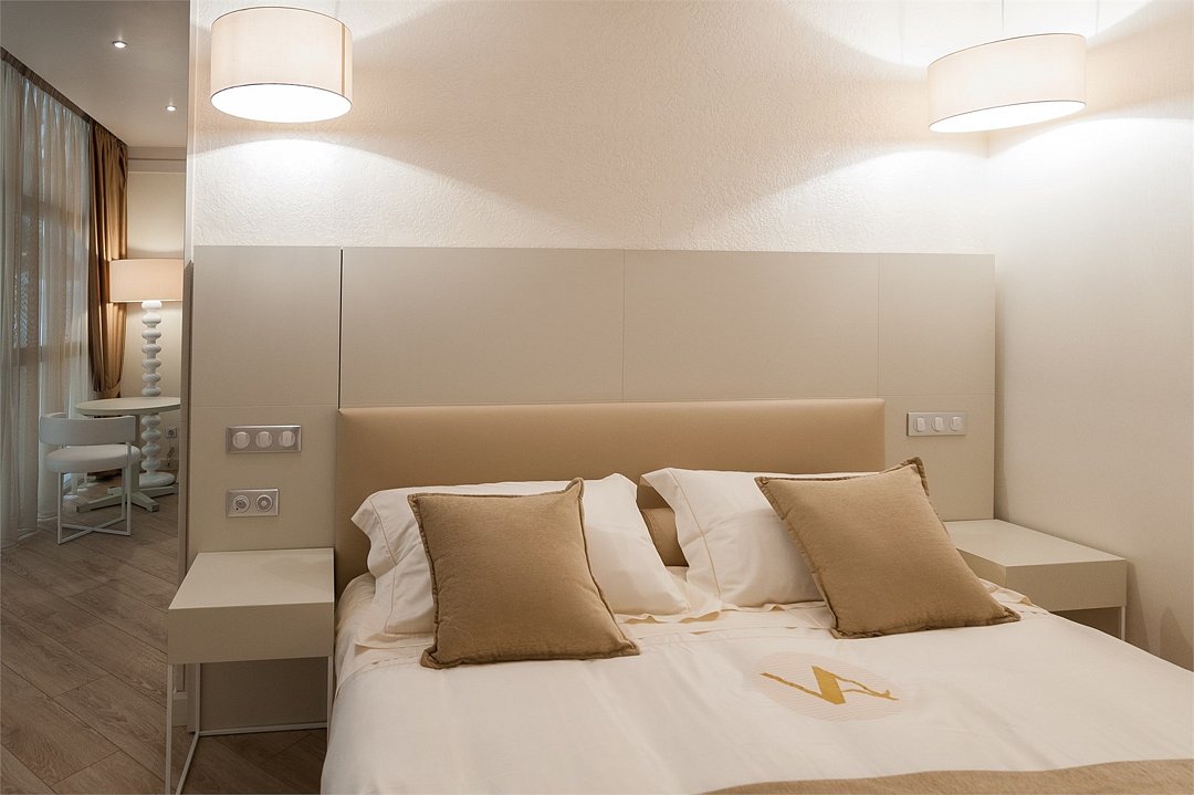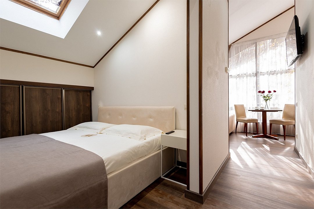 Номера категории "Студио Премиум" в отеле Villa Adriano - просторные однокомнатные номера, площадью 36-50 м2, с визуально разделенной зоной гостиной и спальней, которые позволят в полной мере насладится отдыхом в нашем отеле.Услуги и удобства