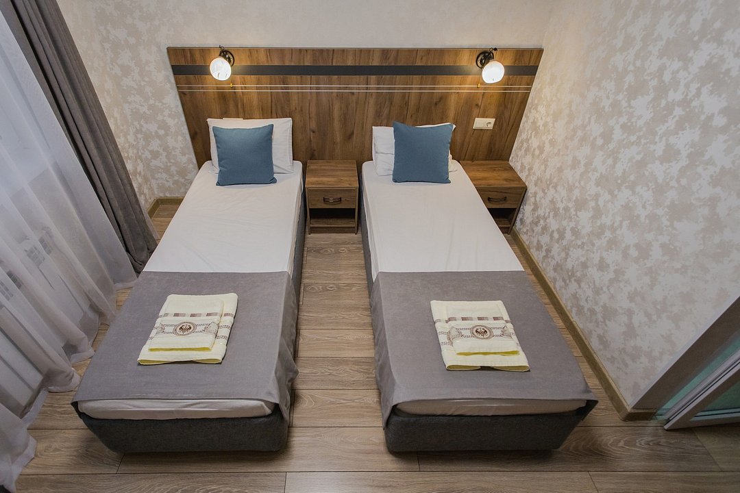 В номере: 1 двуспальная кровать или 2 односпальные кровати, 1 кресло - кровать.