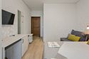 Имеется телевизор, кондиционер, шкаф, вешалка, зеркало, журнальный столик, холодильник, стулья, корзина для мусора.
