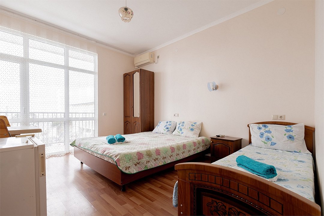 Просторный, уютный номер с одной двуспальной и одной односпальной кроватями и расположен на втором этаже. В номере есть телевизор, холодильник, Wi-Fi. Идеально подойдет для проживания 3-х человек.Услуги и удобства