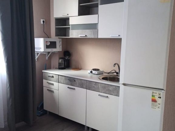 Апартаменты студия площадью 28 кв.м с видом во двор. Подходит для размещения 4 человек. (3 основных места и 1 дополнительное) Апартаменты студия с приятным интерьером. В апартаментах студии: 1 двуспальная кровать, 1 односпальный диван. Имеется телевизор, кондиционер, шкаф, вешалка, обеденный стол, стулья, кухня, посуда, столовые приборы, микроволновая печь, электрический чайник, холодильник, электрическая плита, фен. Индивидуальная ванная комната: душ, раковина, туалет. В стоимость входит: постельное бельё, полотенца, мыло. WI-Fi бесплатно на всей территории. Бесплатная общественная парковка за территорией.В номере