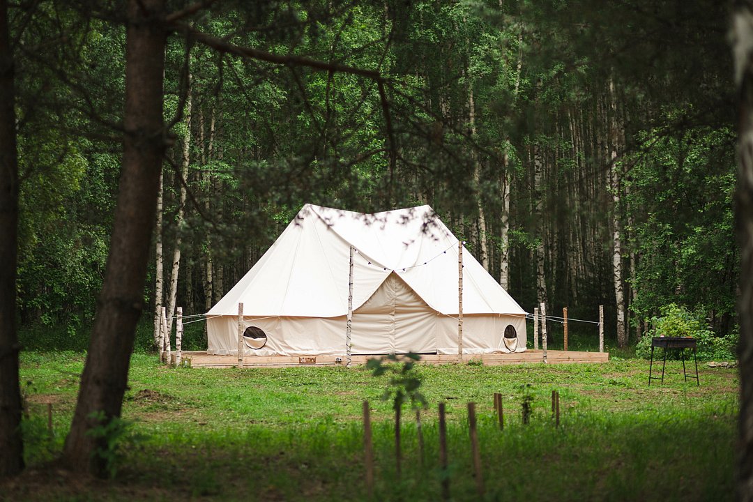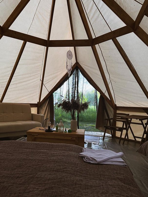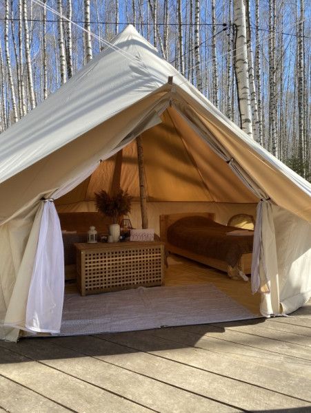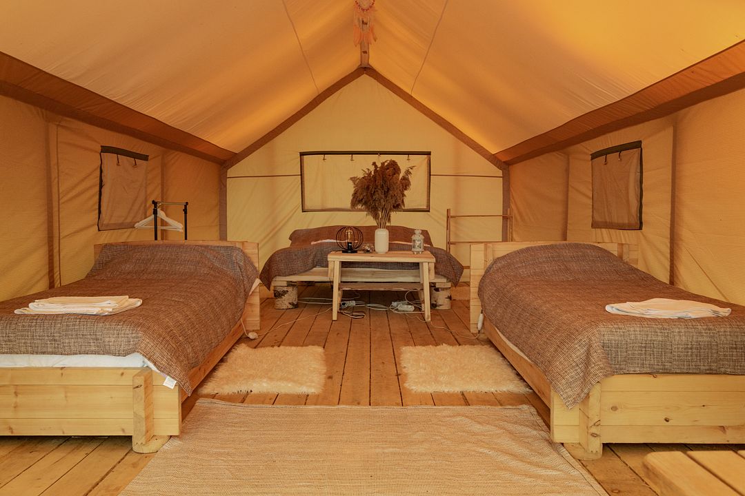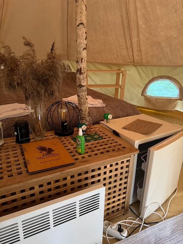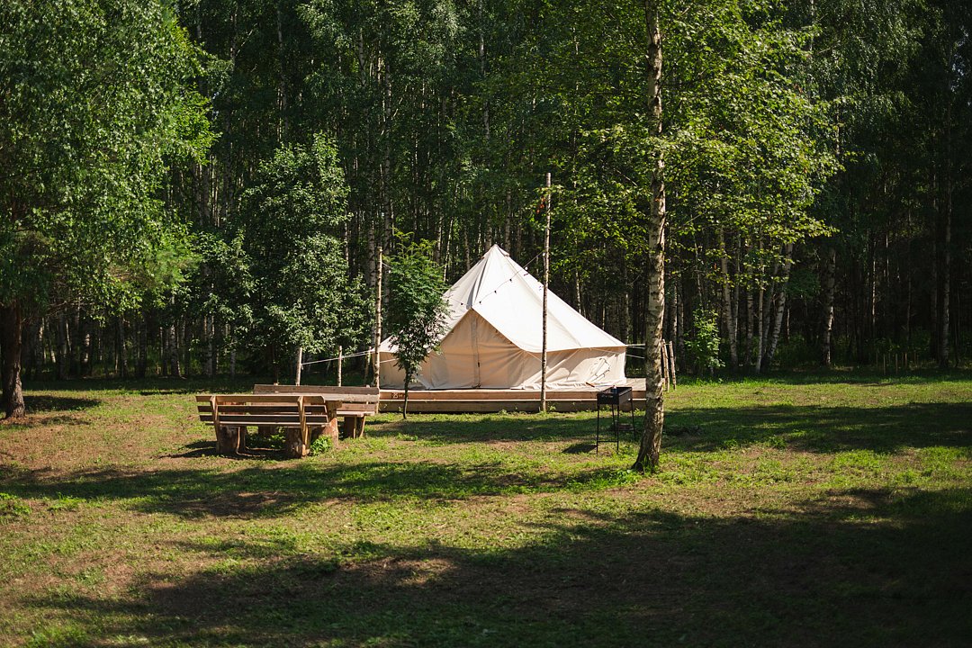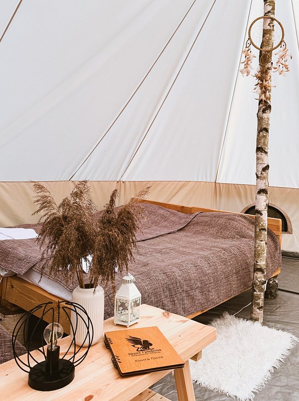 Размещение организовано в стильных шатрах типа «Bell Tent». Они выполнены из натуральных дышащих материалов, хорошо сохраняющих тепло и обеспечивающих комфорт в любую погоду. Каждый шатёр рассчитан на проживание двух-трёх человек. Внутри — электричество и освещение, а рядом установлены мангалы с решётками.