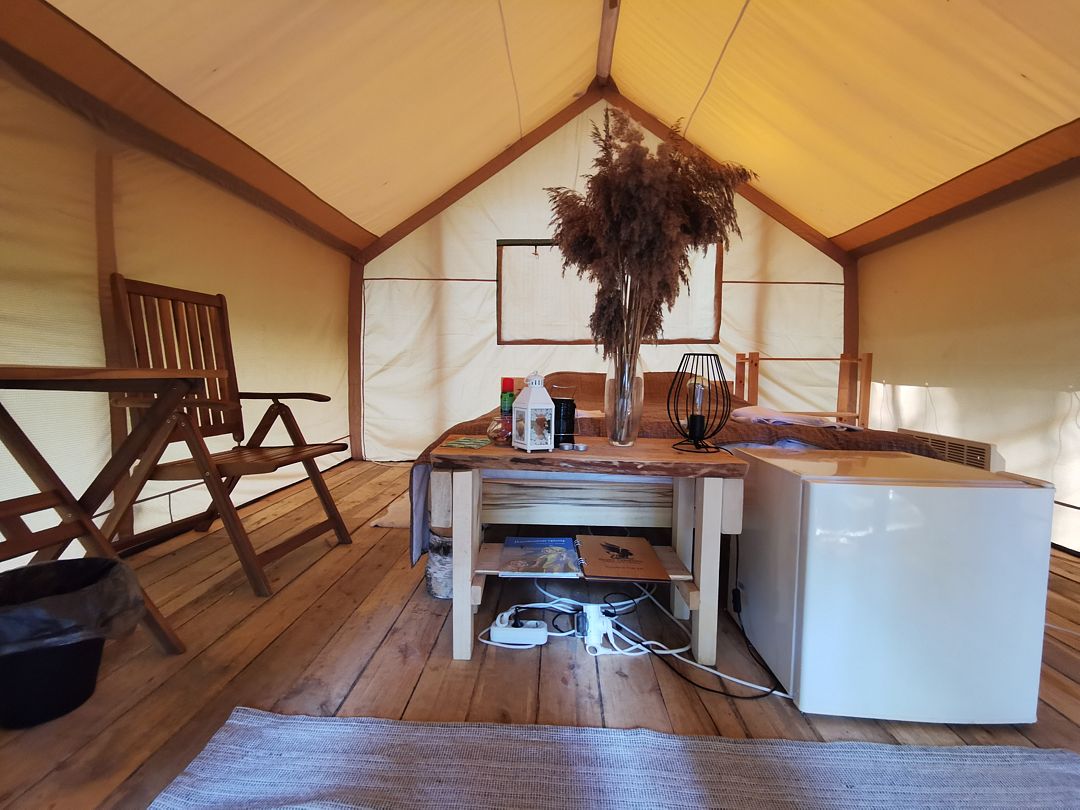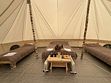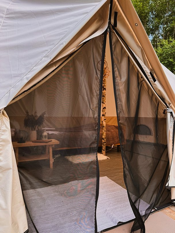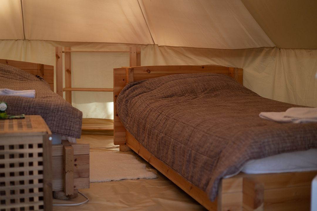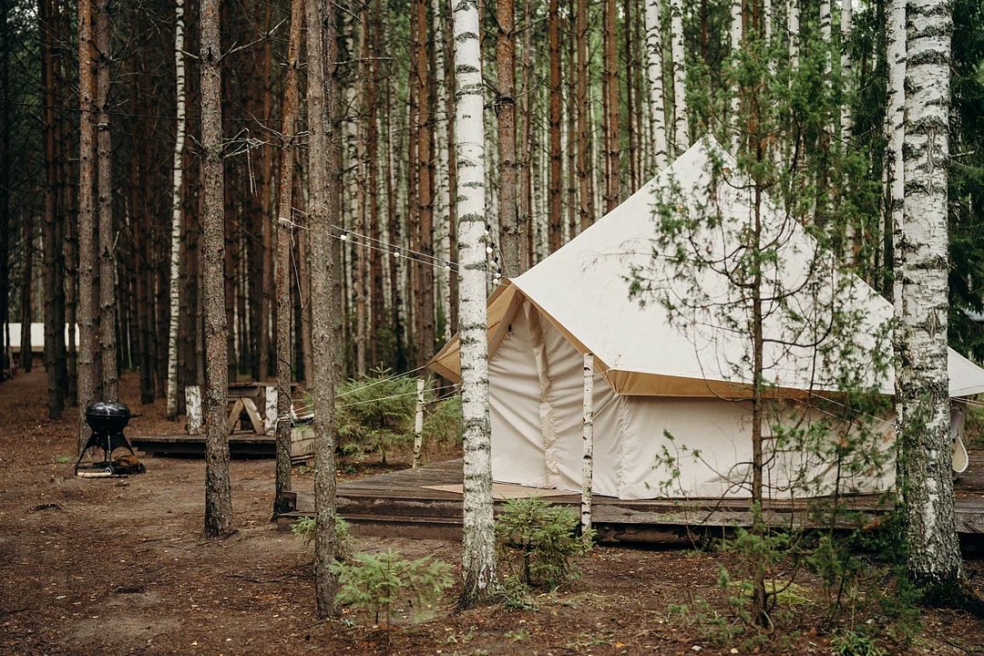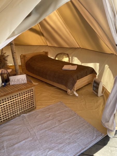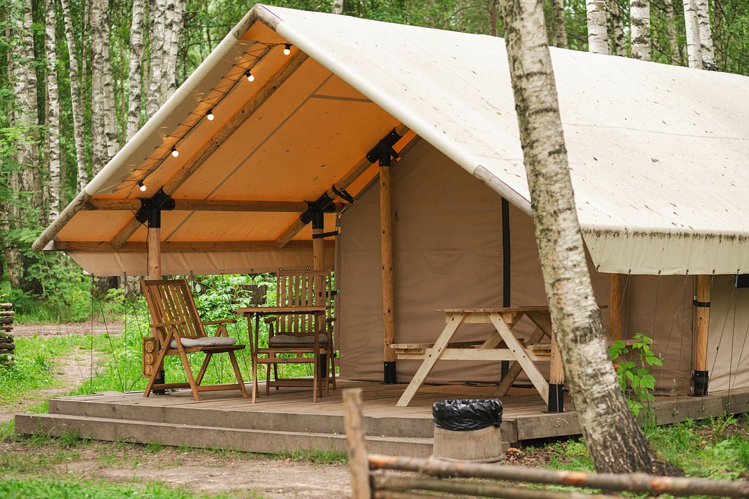 Размещение организовано в стильных шатрах типа «Bell Tent». Они выполнены из натуральных дышащих материалов, хорошо сохраняющих тепло и обеспечивающих комфорт в любую погоду. Каждый шатёр рассчитан на проживание двух-трёх человек. Внутри — электричество и освещение, а рядом установлены мангалы с решётками.