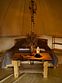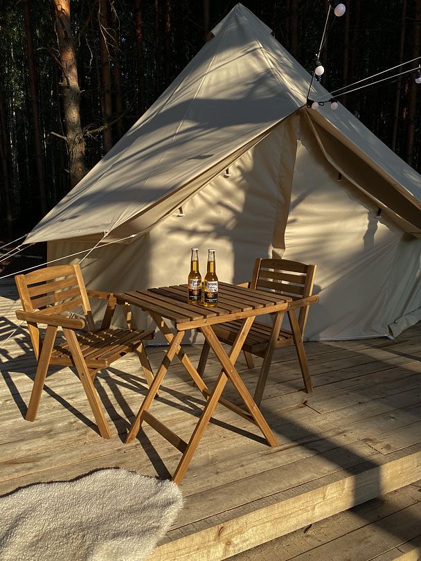 Авторские шатры из натуральных дышащих материалов, хорошо удерживающих тепло. В одном шатре может находиться 2-4 человека. Освещенная территория, а также наличие электричества внутри. Рядом с шатром мангал и решетка.