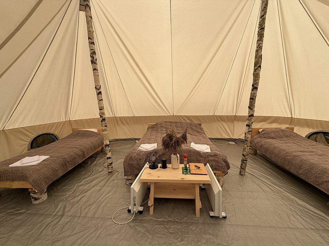 В шатрах комфортабельная постель. Белоснежное постельное белье и ортопедические матрасы помогут забыться во сне. Камины и электрические простыни не позволят замерзнуть. Персональные зоны отдыха у каждого шатра, первая береговая линия. Есть возможность заказать трехразовое питание, предпочтения учитываются.