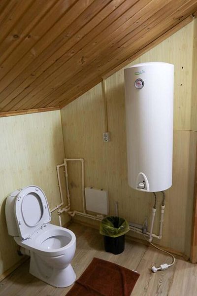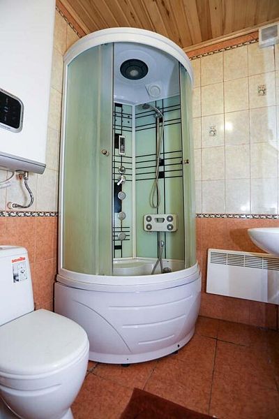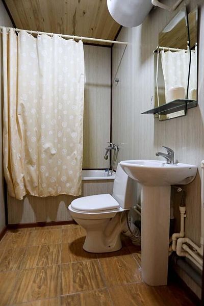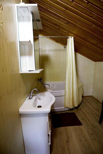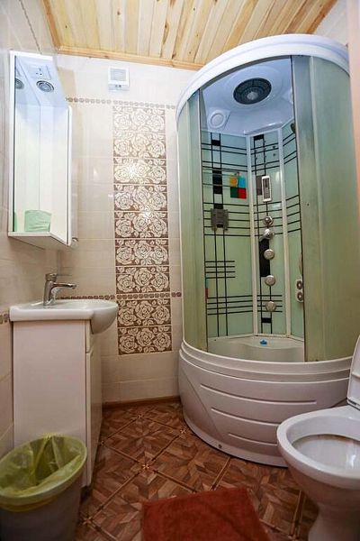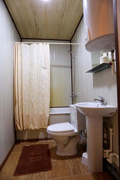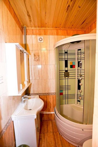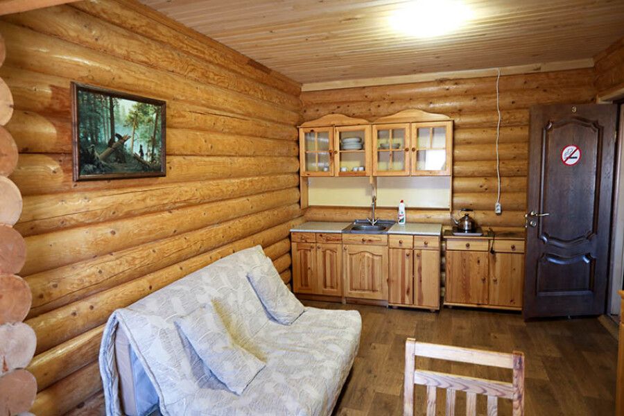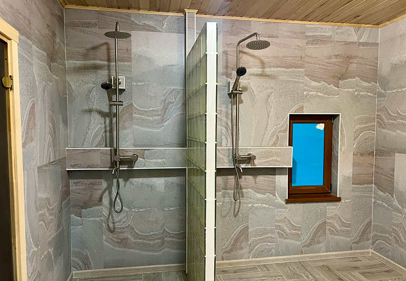 В доме: два номера площадью 16 м2 с панорамным остеклением, один номер площадью 14 м2, общая гостиная, две ванные комнаты.