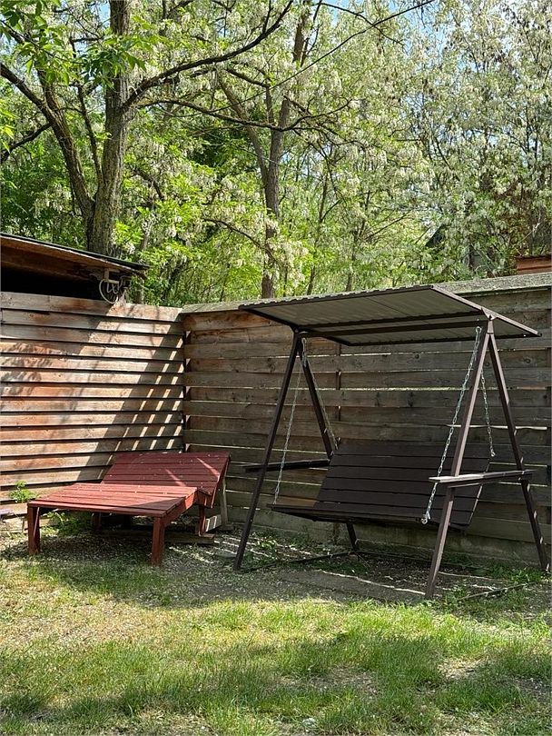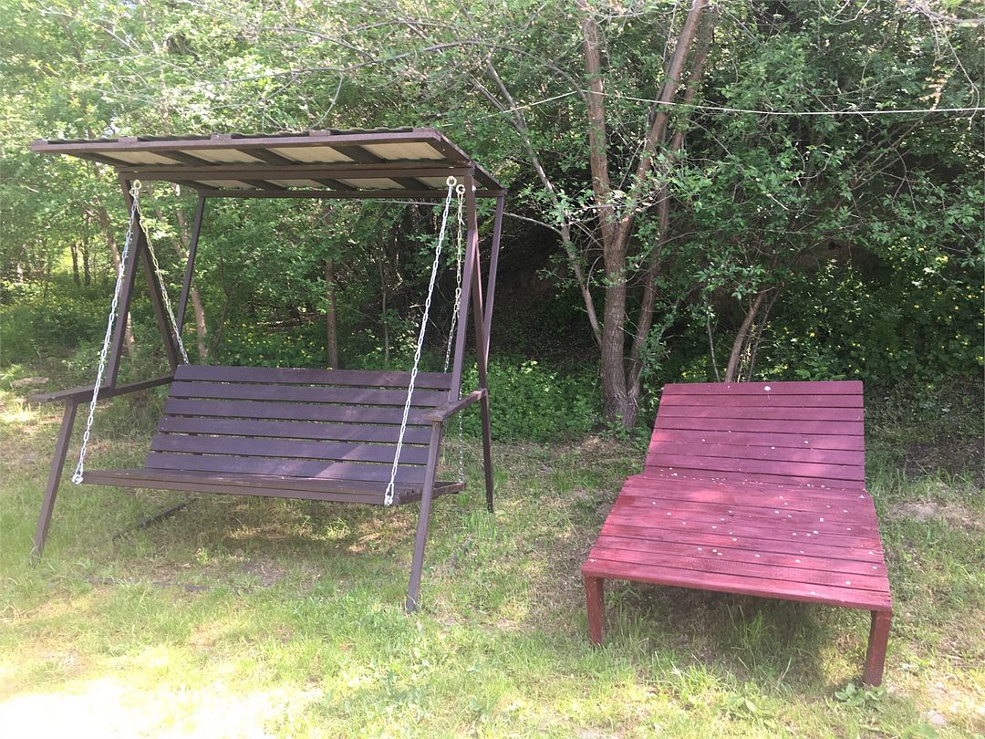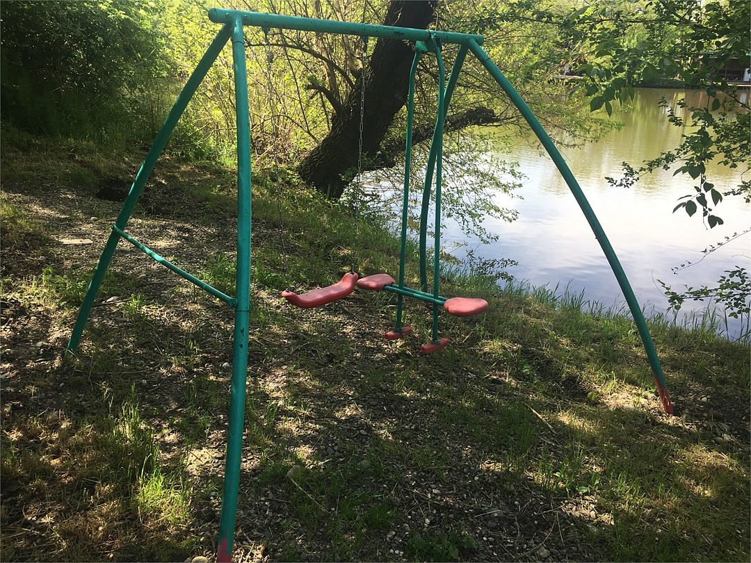 Беседка оборудована всем необходимым: пирс, мангал, холодильник, чайник, качели.