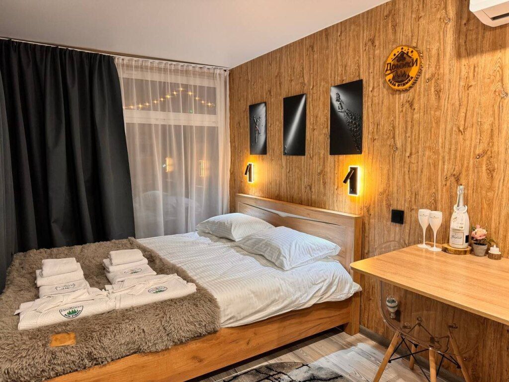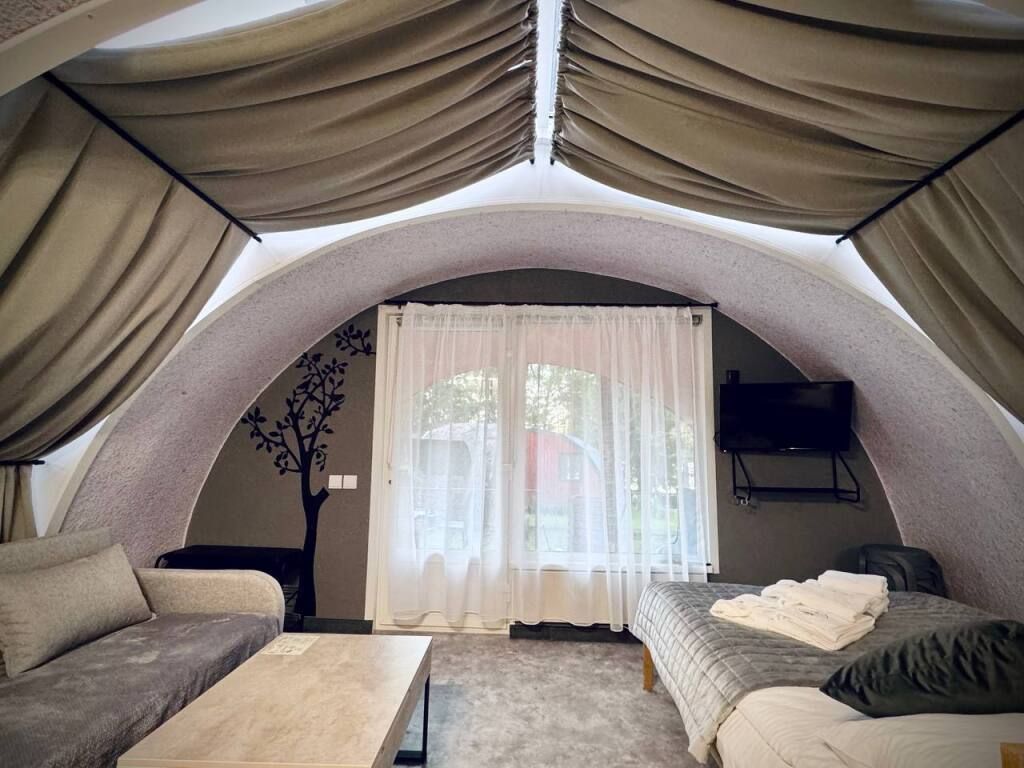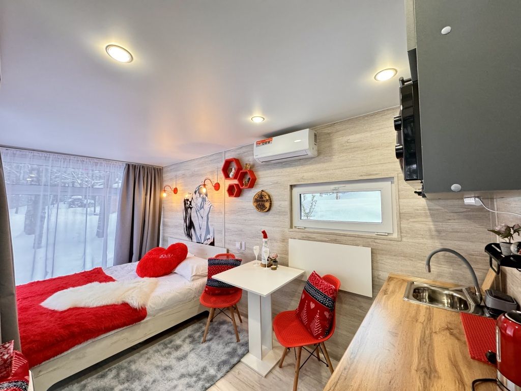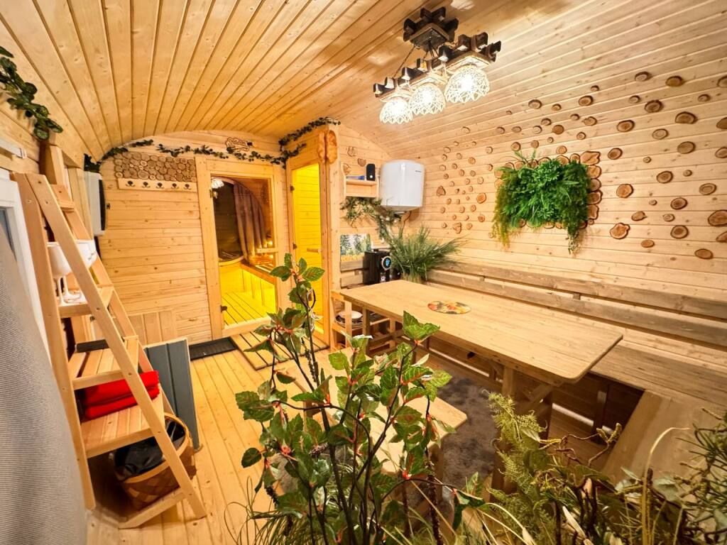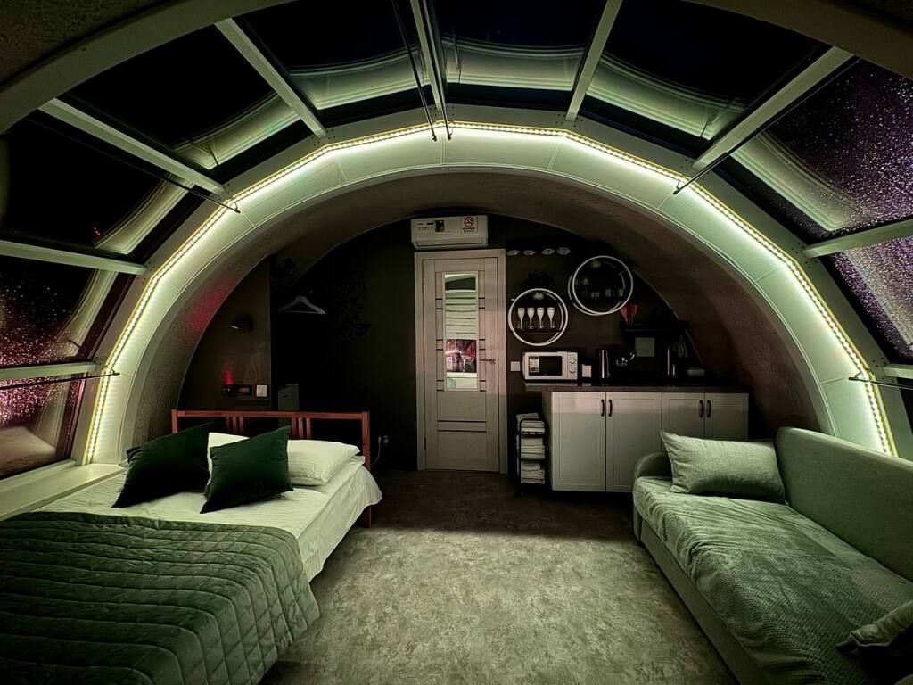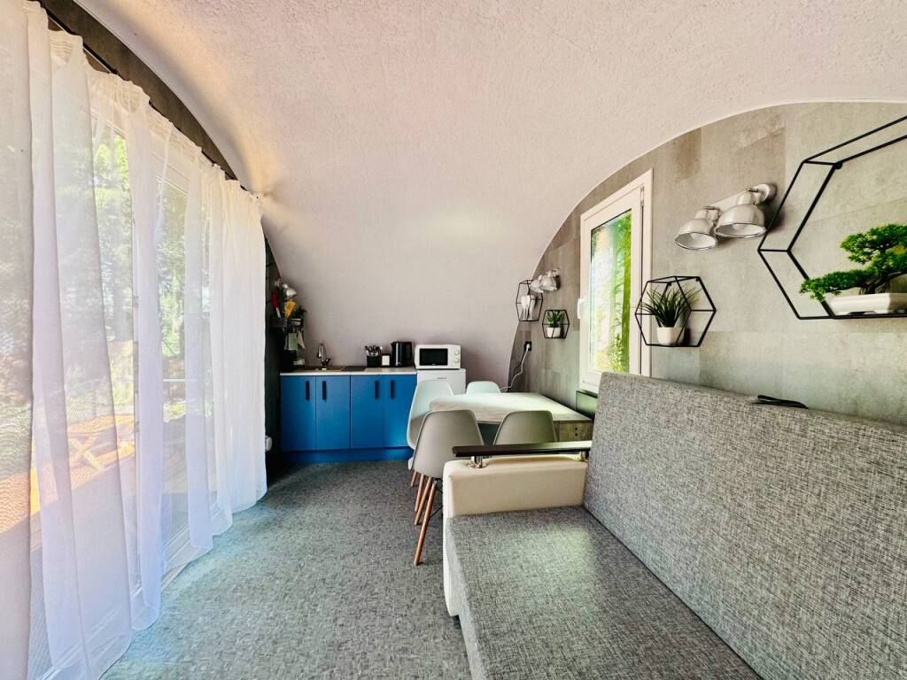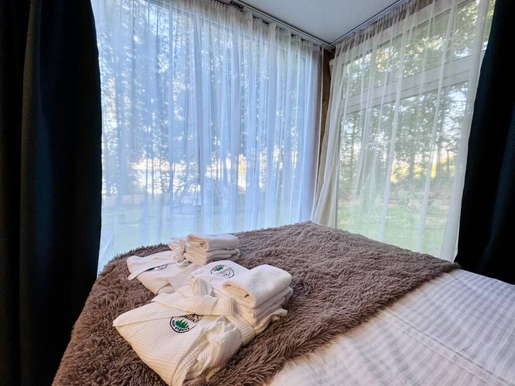 Гостям предлагается шесть домиков в окружении природы. В домиках тёплые полы с индивидуальной регулировкой температуры, панорамные окна с видом на озеро, кухня с холодильником, микроволновкой и плитой, сан узел с душевой и теплым полом, кондиционер, бойлер с горячей водой. Есть возможность готовить пищу самостоятельно. Гостям предоставляются мыло, шампунь, полотенца, халаты и тапочки, предоставляется доступ к сети Wi-Fi.