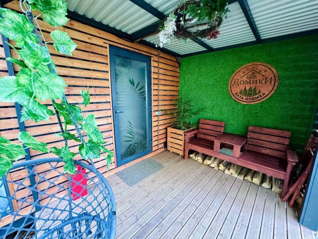Каждый домик оснащён индивидуальной мангальной зоной, где для приготовления барбекю имеются посуда, шампуры, решетка. За дополнительную плату доступны казан и коптильня.