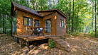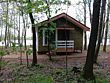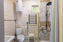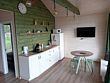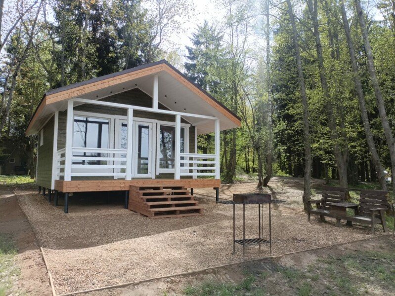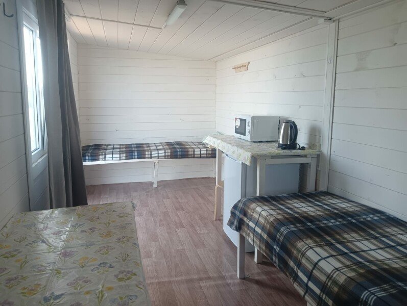 Одноэтажный домик (25 кв.м.) с отдельной спальней и общей кухней-гостиной. Рассчитан на комфортное проживание не более 3х взрослых или семью с детьми.