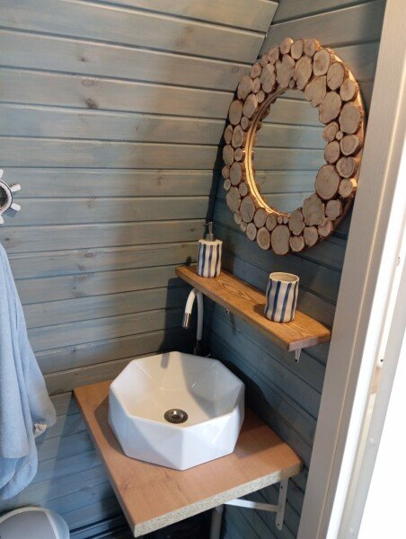 Двухместный Домик у воды. Рассчитан на двух гостей, в домике микроволновка, чайник, посуда, холодильник, сан узел, душевая кабина.