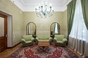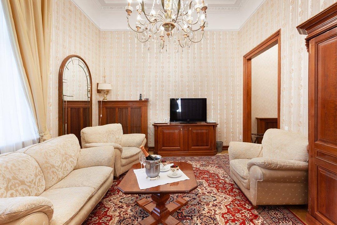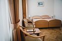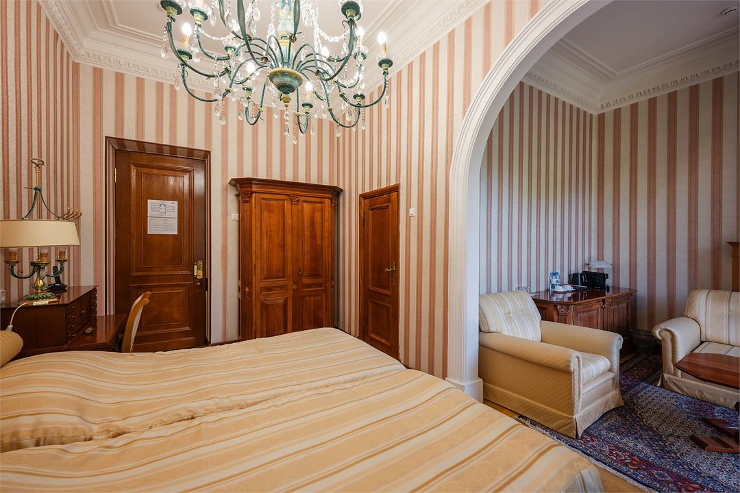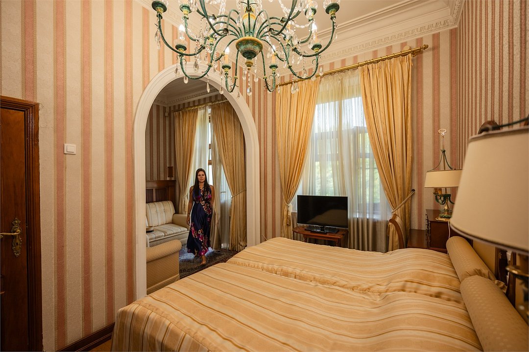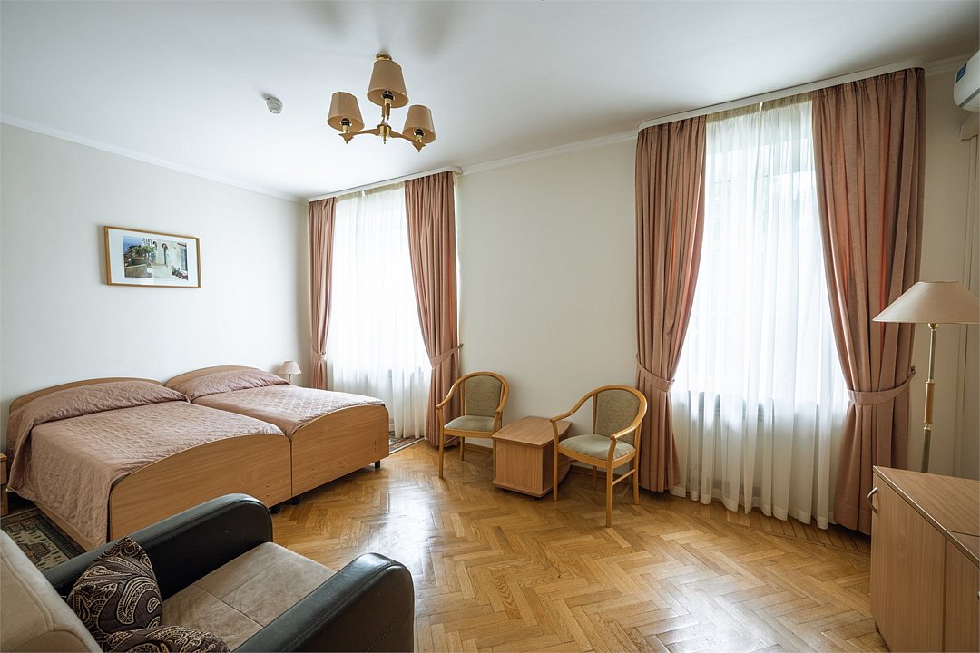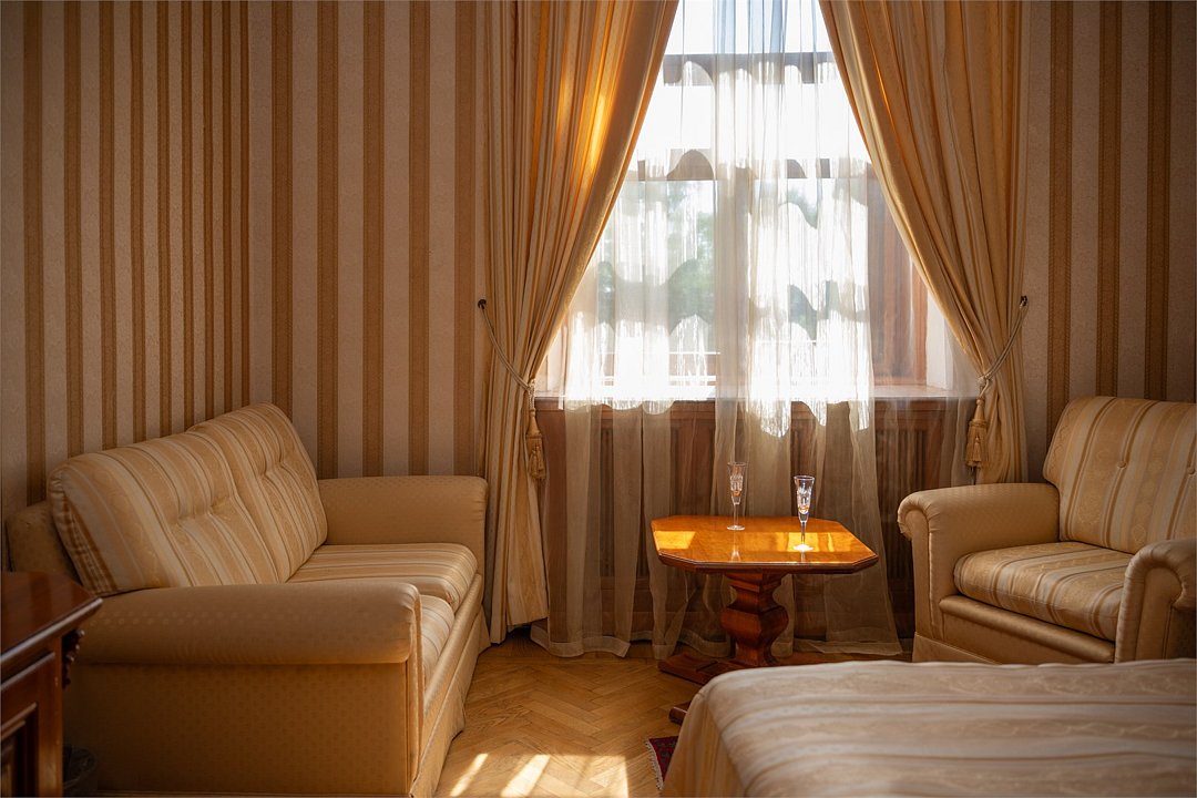 Номер категории Люкс расположен в филиале Главного корпуса. Общая площадь 57 м², имеет две комнаты, выходит на солнечную сторону с видом на парк.
