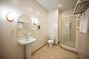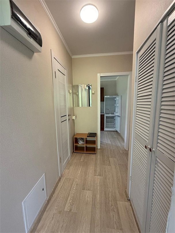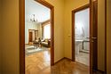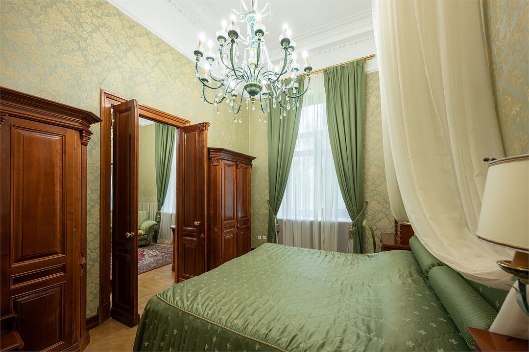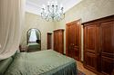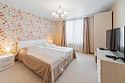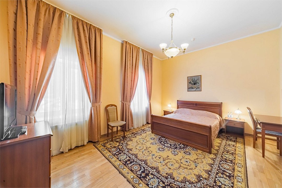 Классический интерьер с паркетными полами, мягким текстилем и светлыми тонами располагает к спокойствию и умиротворению. Пространство продумано до мелочей: удобная кровать, рабочая зона, шкаф для вещей и ванная комната с необходимыми принадлежностями.