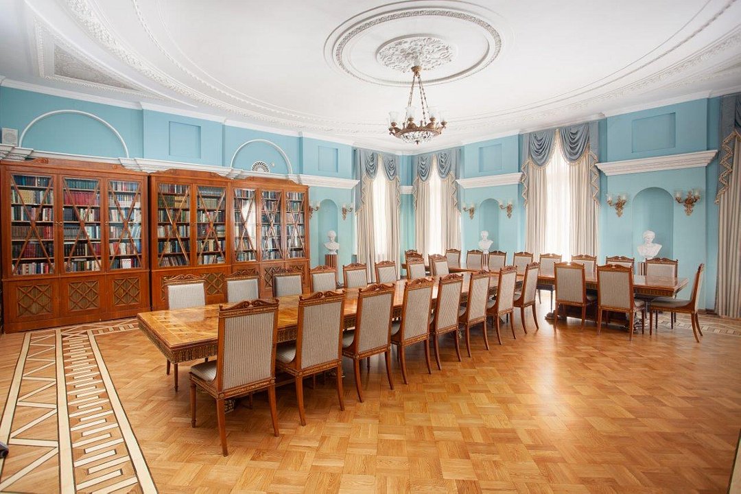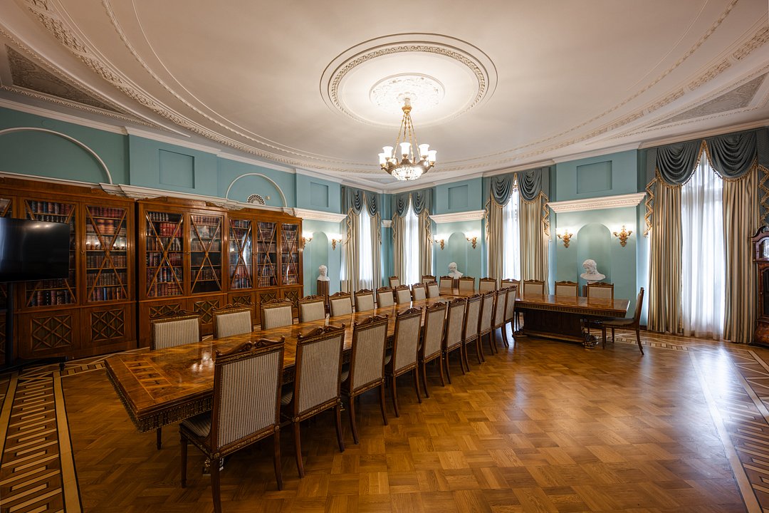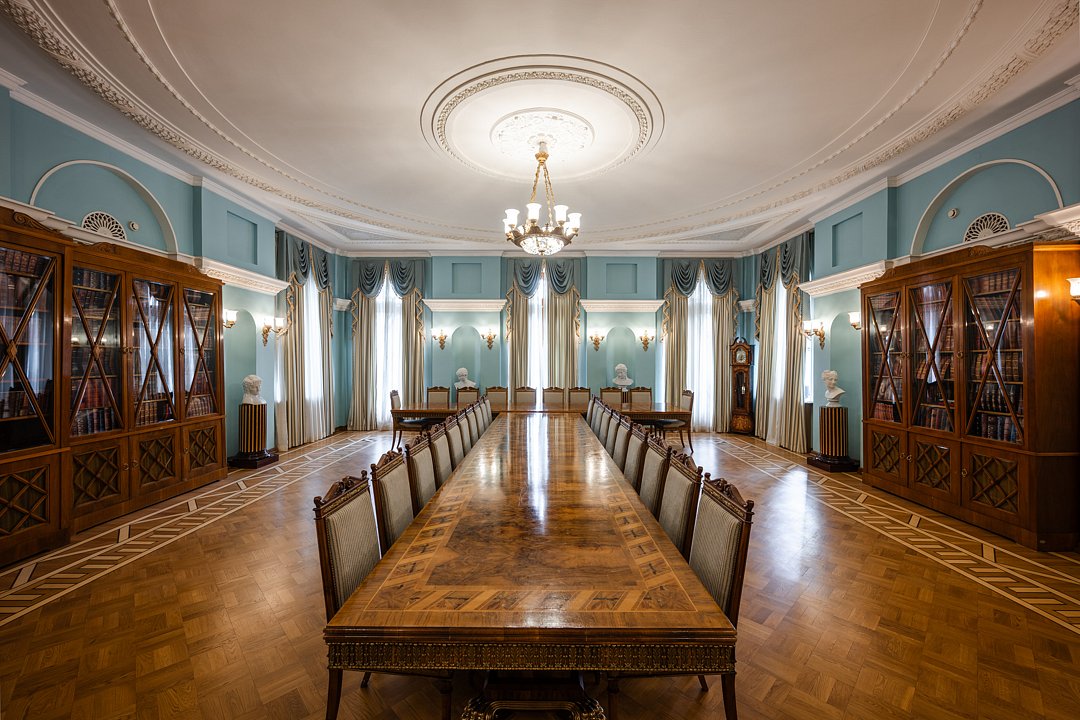 Банкетный зал «Библиотека» в парк-отеле «Усадьба Морозовка» предлагает просторное помещение с дневным освещением и собственным балконом. Зал оборудован Wi-Fi и предоставляет возможность рассадки гостей в формате буквы «Т» на тридцать человек.