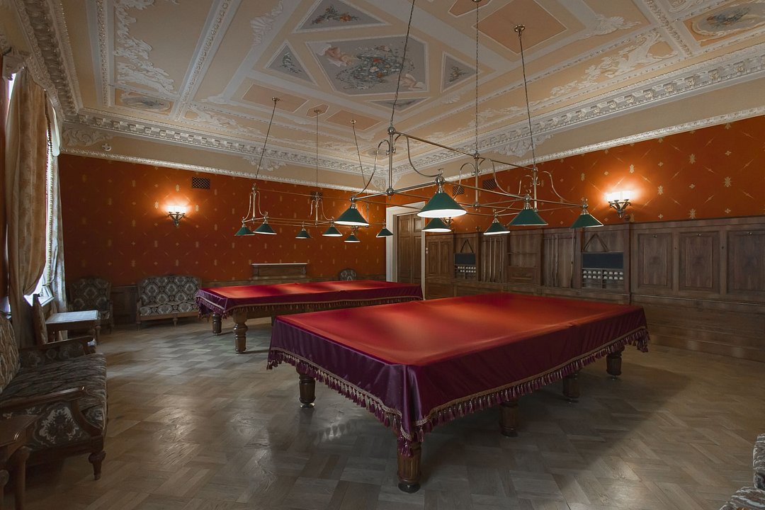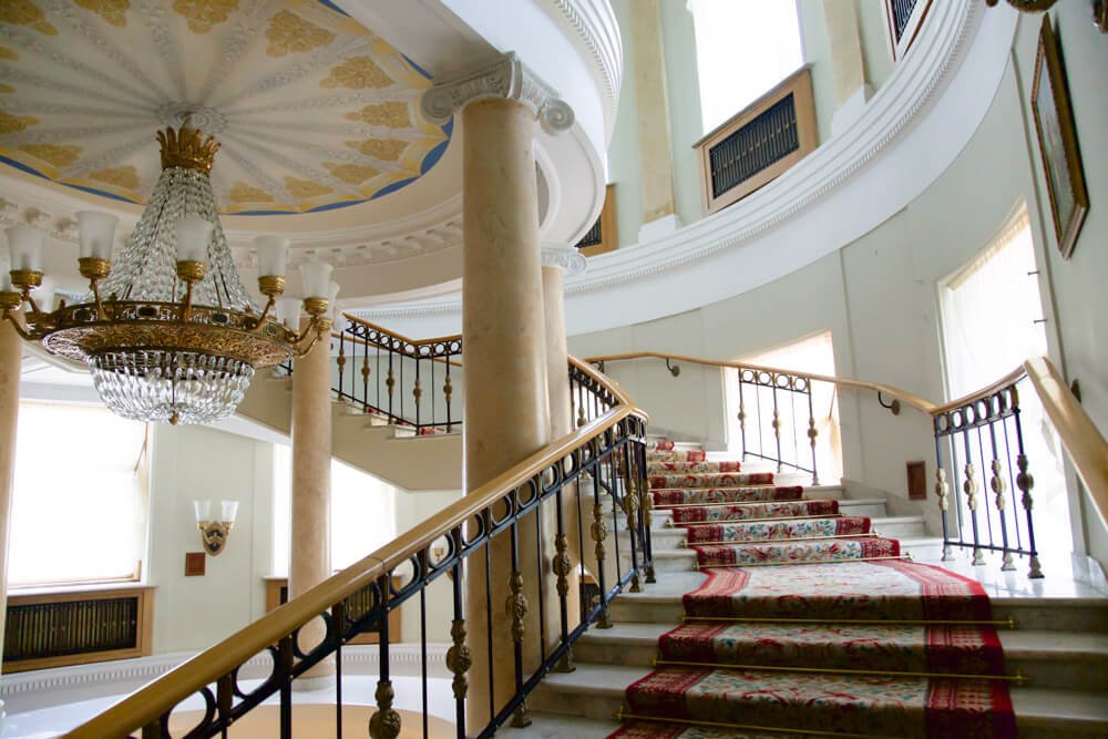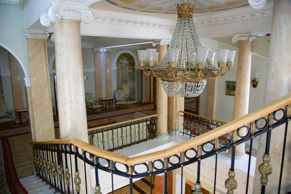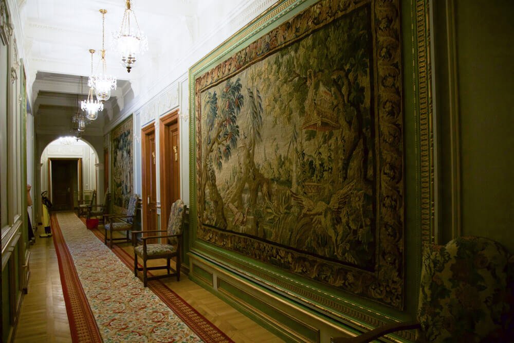 При выборе номера для проживания (с учётом примерно равной цены за номер) мы пожертвовали двухкомнатным люксом в корпусе Филиал в пользу стандартного однокомнатного в Главном корпусе. Хотелось ощутить себя хоть и ненадолго в архитектурной сказке: высокие потолки, шикарные люстры, классический дизайн, коридоры с оригинальной мебелью прошлого века (причем в хорошем состоянии) и ещё более древними гобеленами.