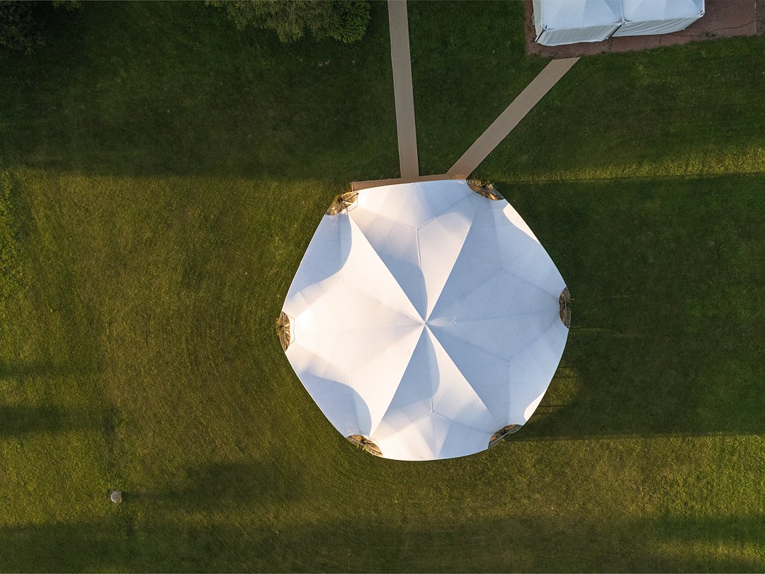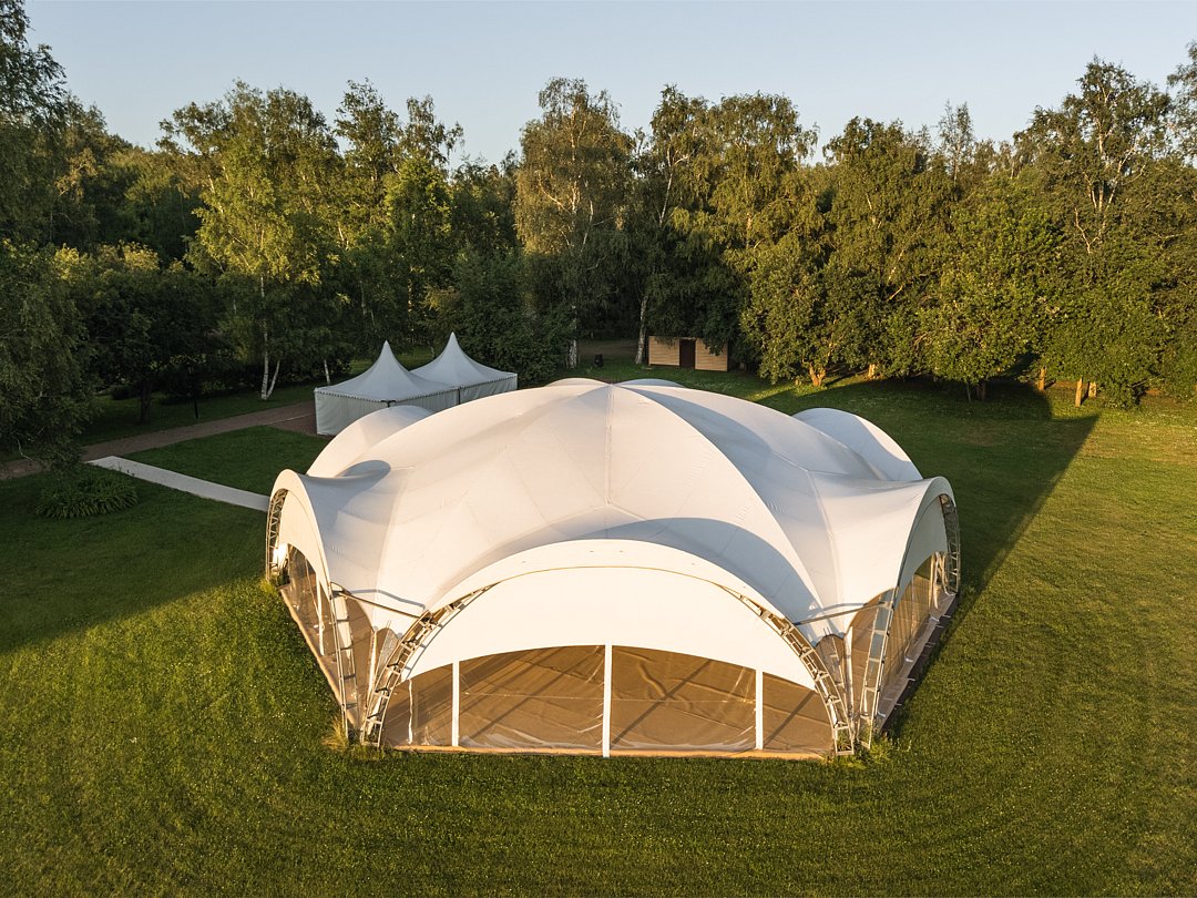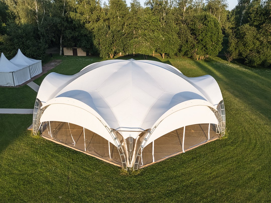 Шатер площадью 260 м² с шестигранной формой, высотой входа 4,5 м и куполом 6,3 м обеспечивает простор и изысканность. Он вмещает до 260 гостей при фуршете или до 160 человек за круглыми столами. В стоимость аренды уже включены: напольное покрытие, драпировка потолка, банкетная мебель, автономный туалетный модуль, а также уборка и вывоз мусора после мероприятия — все для вашего комфорта и беззаботной подготовки к торжеству.