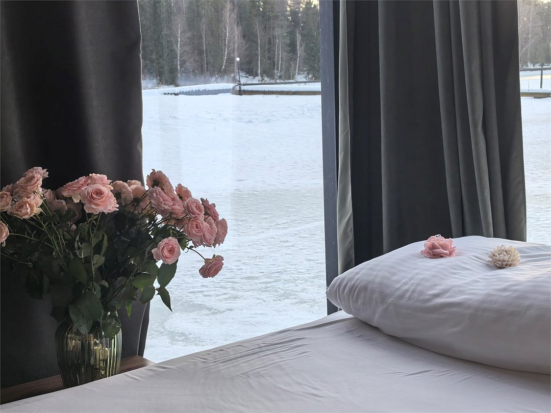 Уединённый домик «Селена» — идеальное место для отдыха вдвоём. Из панорамного окна открывается завораживающий вид на вековые сосны и гладь залива Истринского водохранилища.