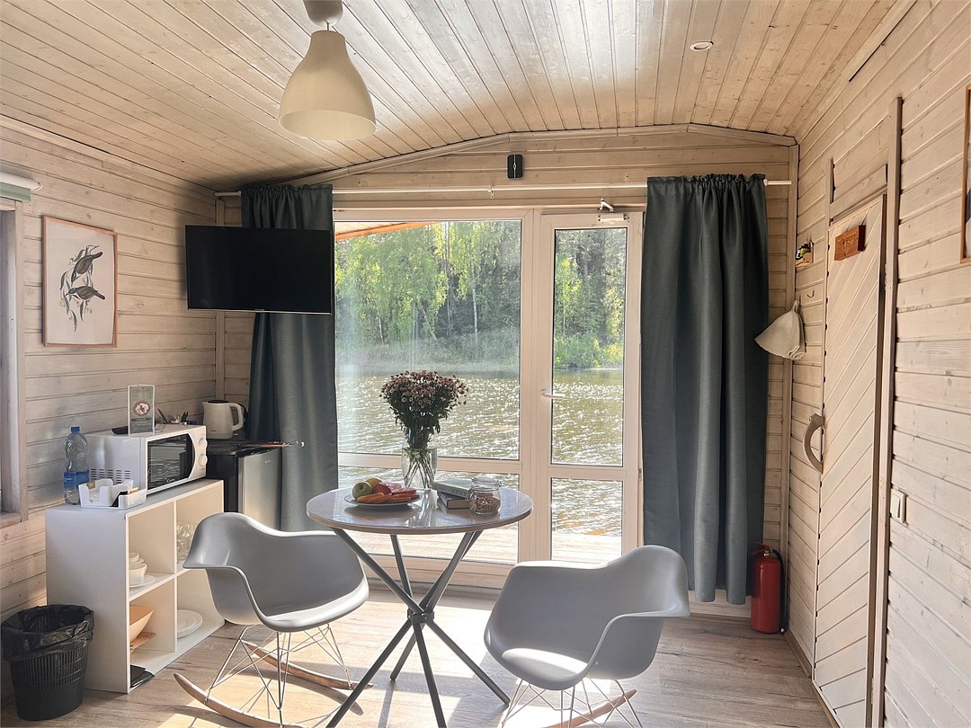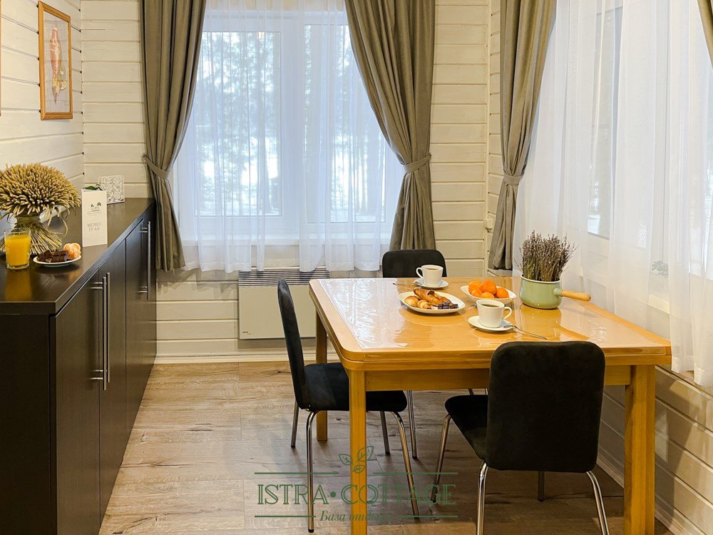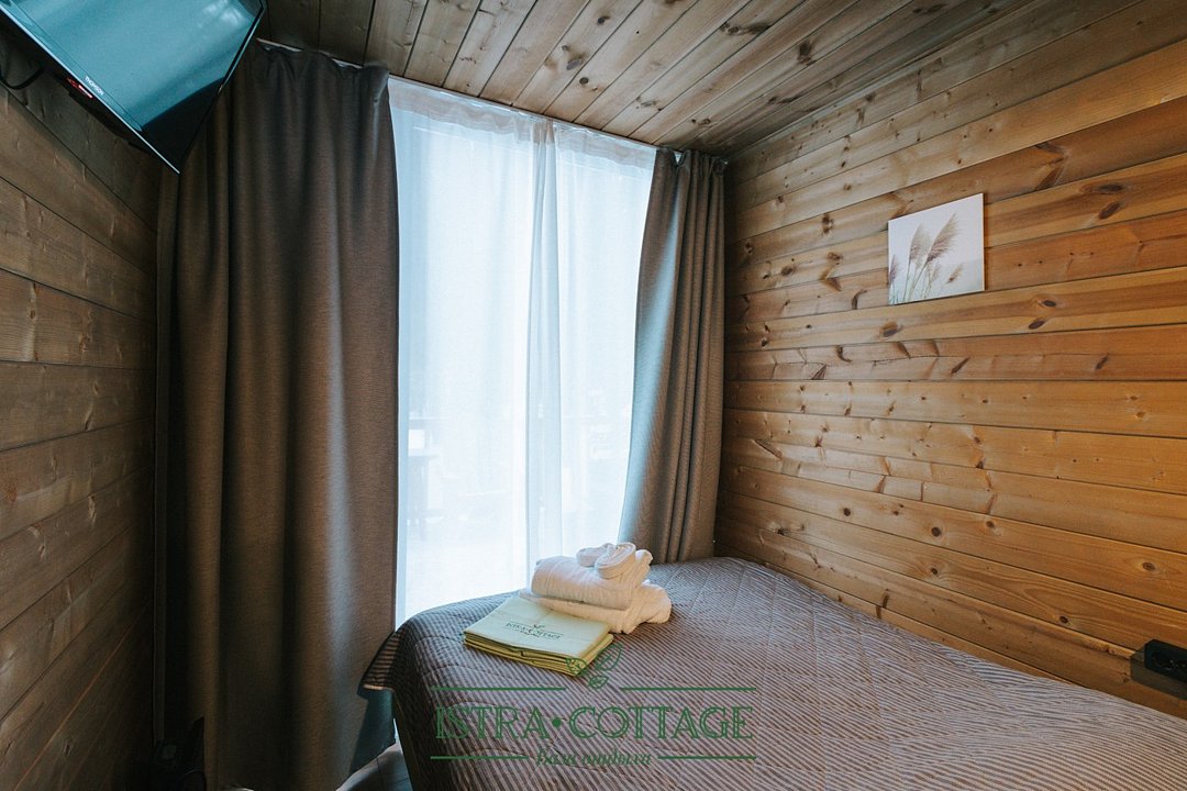 Уютный и комфортный дом с камином. Внутри: спальня, санузел и гостиная с панорамным окном. Мини-кухня с посудой, плитой, СВЧ-печью, чайником и холодильником. Тёплый пол, собственная мангальная зона. Из панорамного окна открывается вид на сосновый бор и Истринское водохранилище.