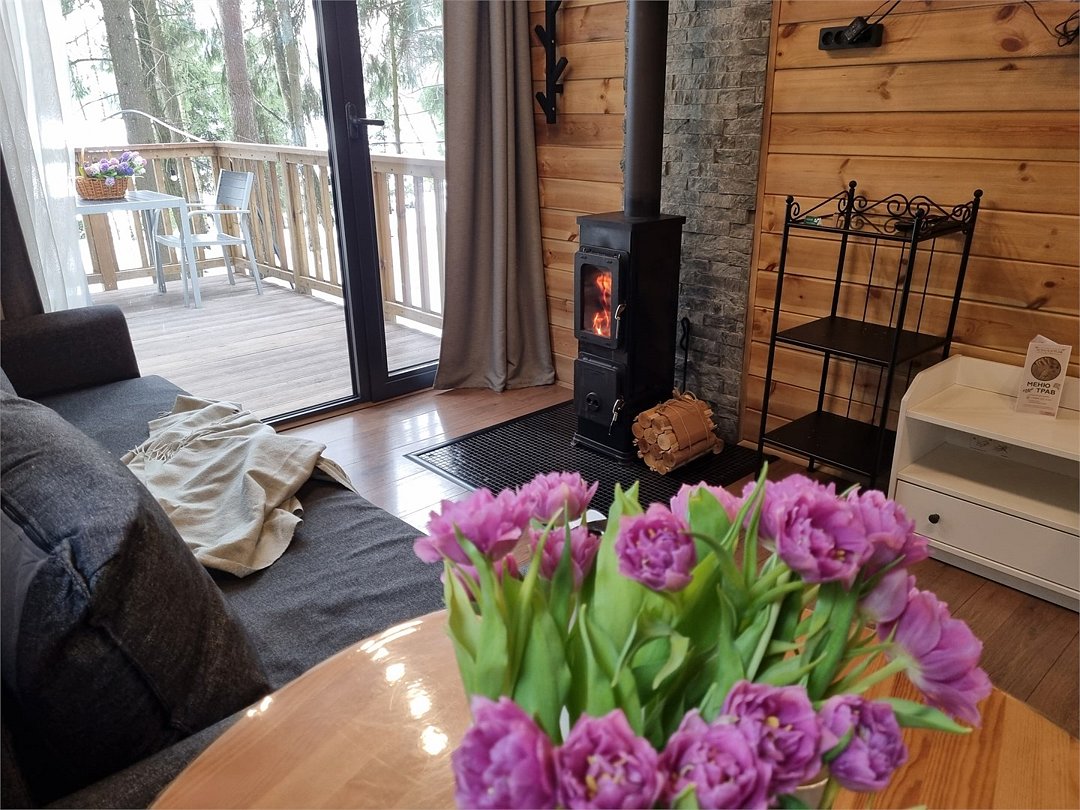 Двухкомнатный уютный домик «Гелиос» с камином. Панорамный вид на сосны и водохранилище, горячий чан с ароматными травами. Идеален для уединённого отдыха вдвоём.