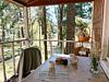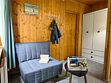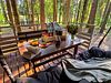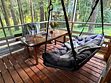 Первый этаж: комната с двуспальным диваном, односпальным диваном и телевизором; кухня; санузел (душ, унитаз, раковина); закрытая веранда с комплектом столовой мебели, камином и подвесными качелями.