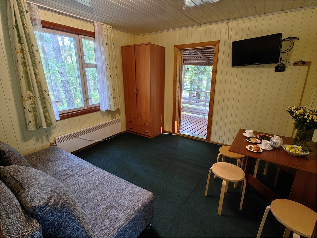 Уютный сезонный дом с закрытой верандой и камином. Подходит для комфортного размещения 4 взрослых и 1 ребёнка (до 12 лет).