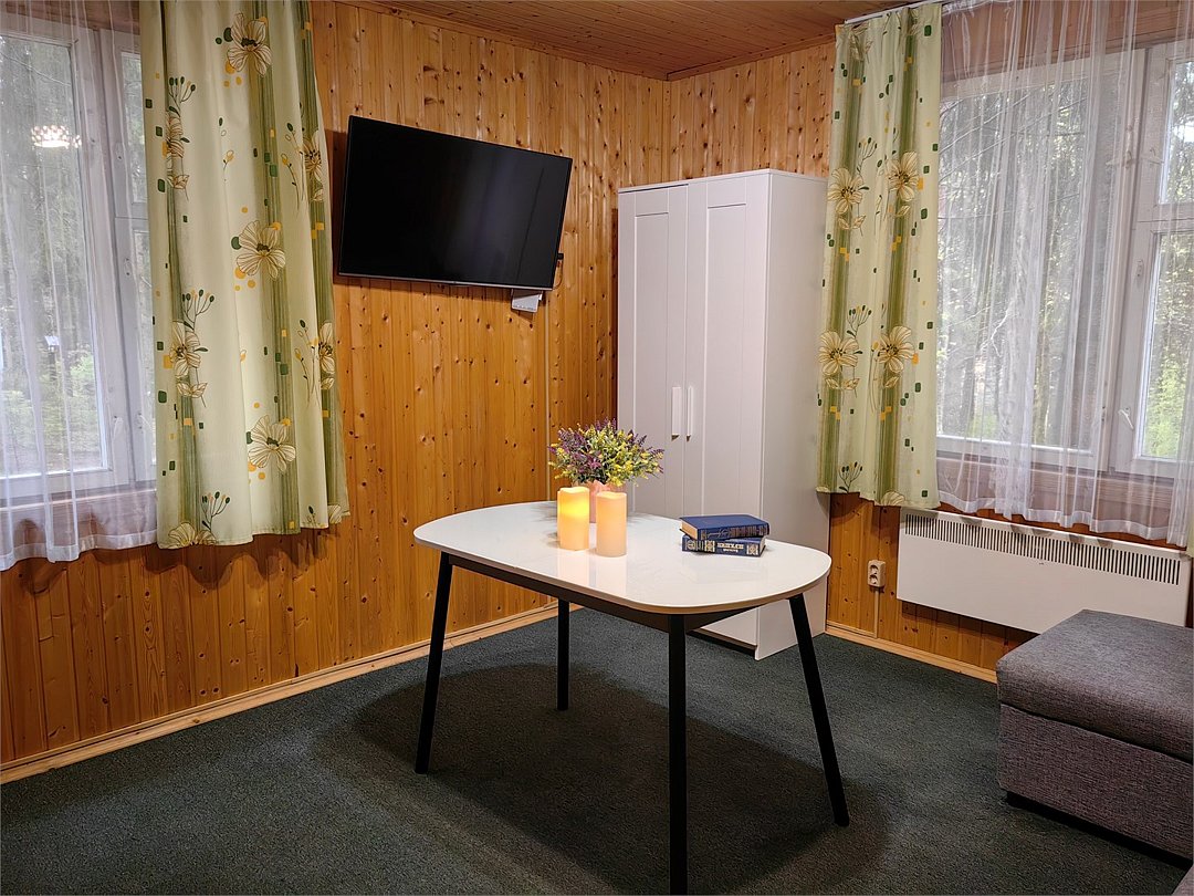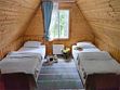 Комплекс состоит из коттеджей. Они напоминают деревянные избушки, включающие два этажа. Каждый дом рассчитан на несколько человек. Внутри имеется все необходимое для комфортного размещения. Ванная отдельная.