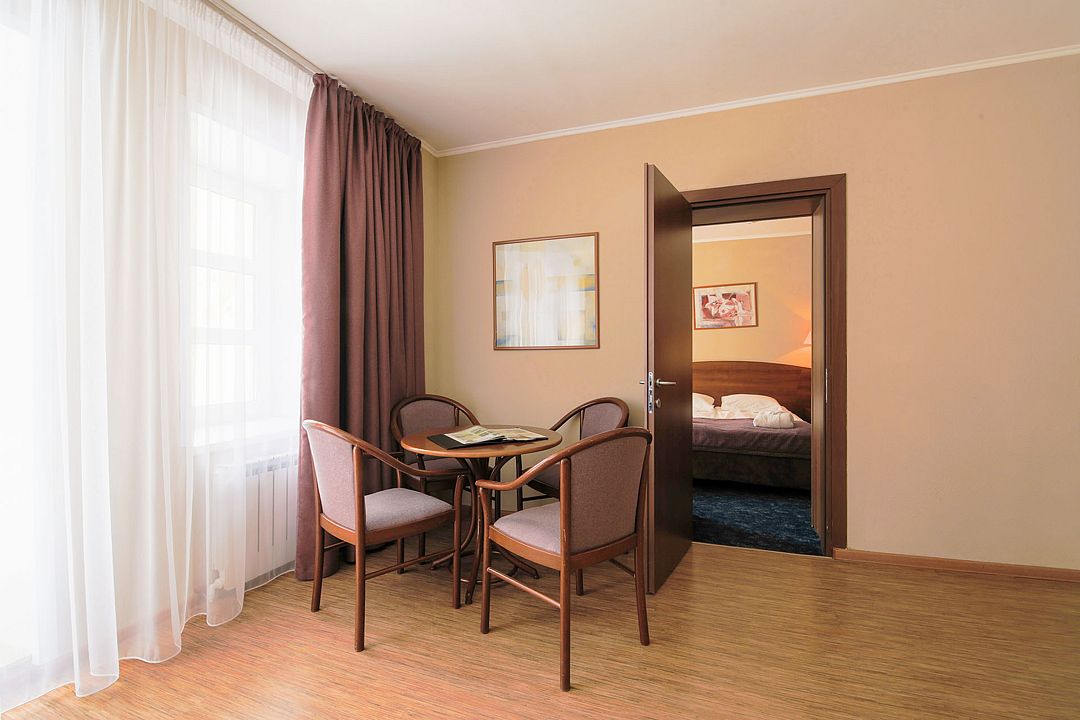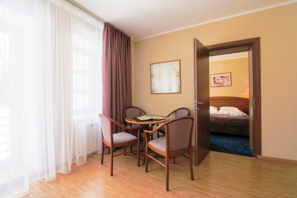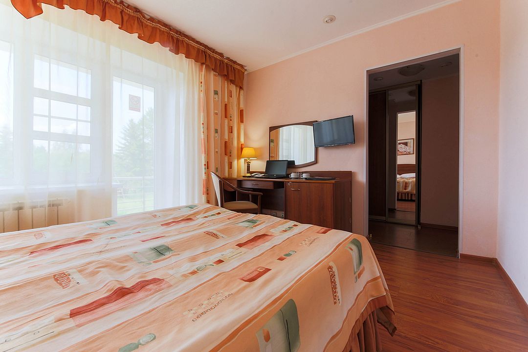 Просторный двухкомнатный номер с двуспальной кроватью, двумя односпальными кроватями, рабочей зоной, ванной комнатой и балконом с видом на лес.