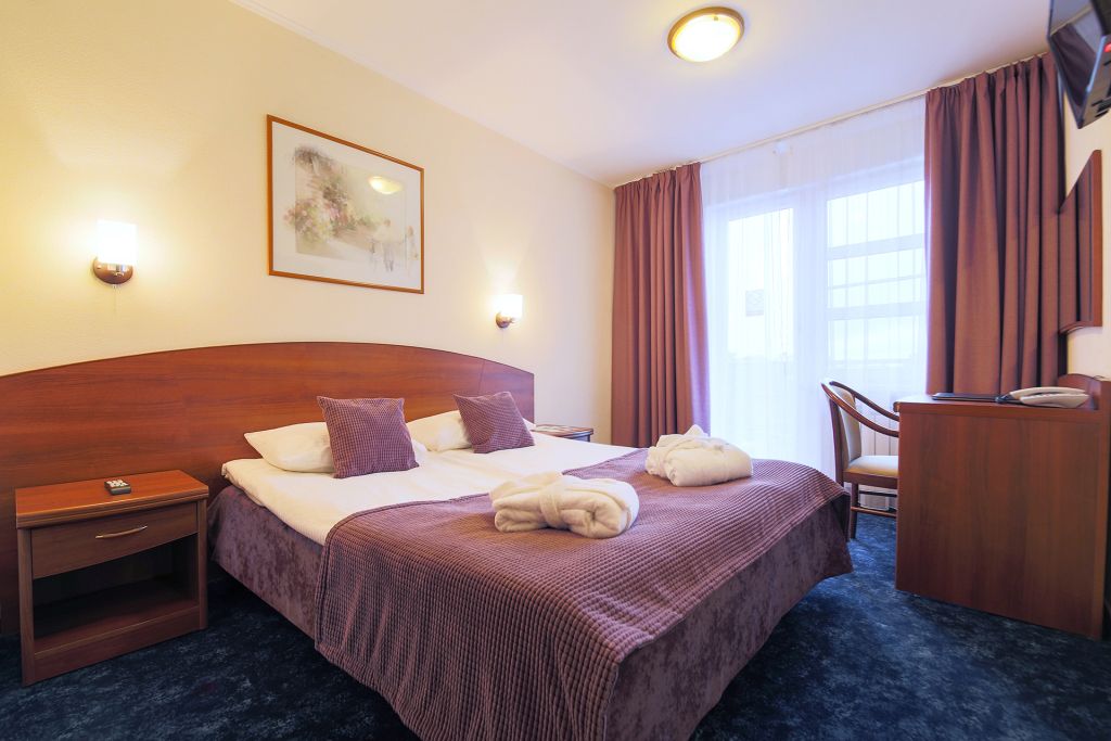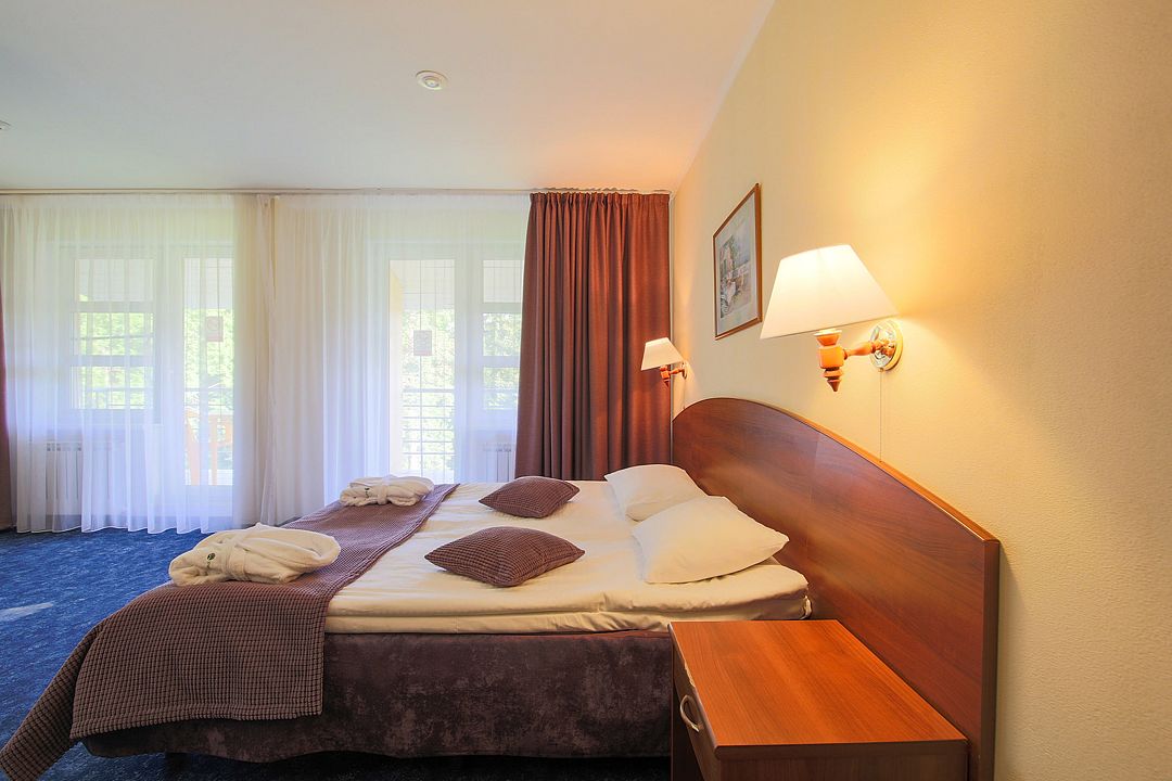Однокомнатный уютный номер с двуспальной кроватью и балконом с видом на лес.