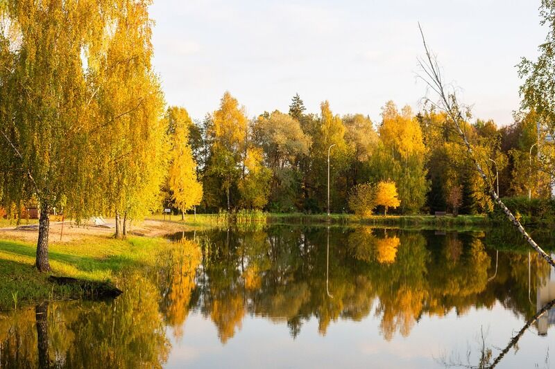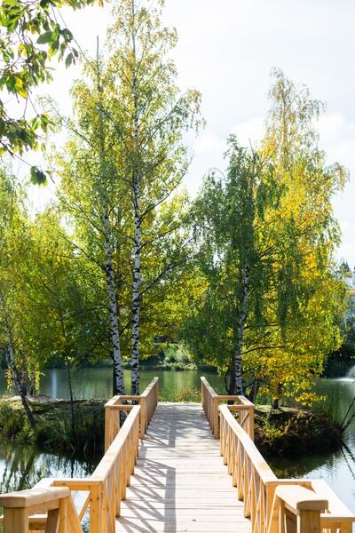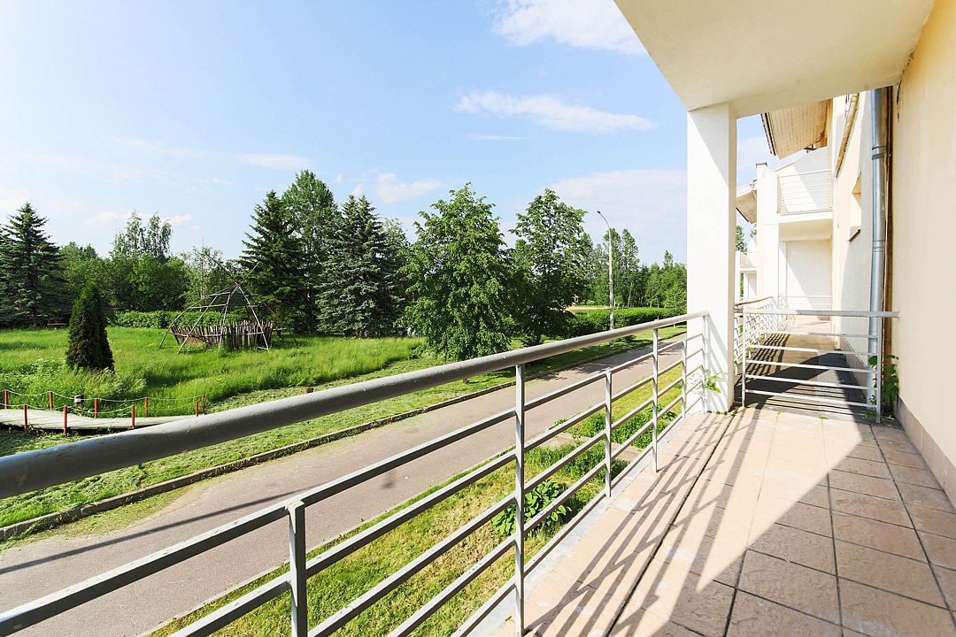 Однокомнатный уютный номер с двуспальной кроватью и балконом с видом на озеро или парк.