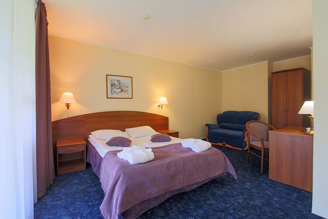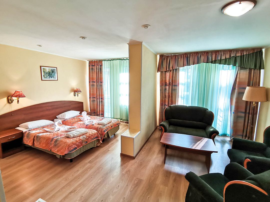 Просторный двухкомнатный номер с двуспальной кроватью, диваном, ванной комнатой и балконом с видом на лес.